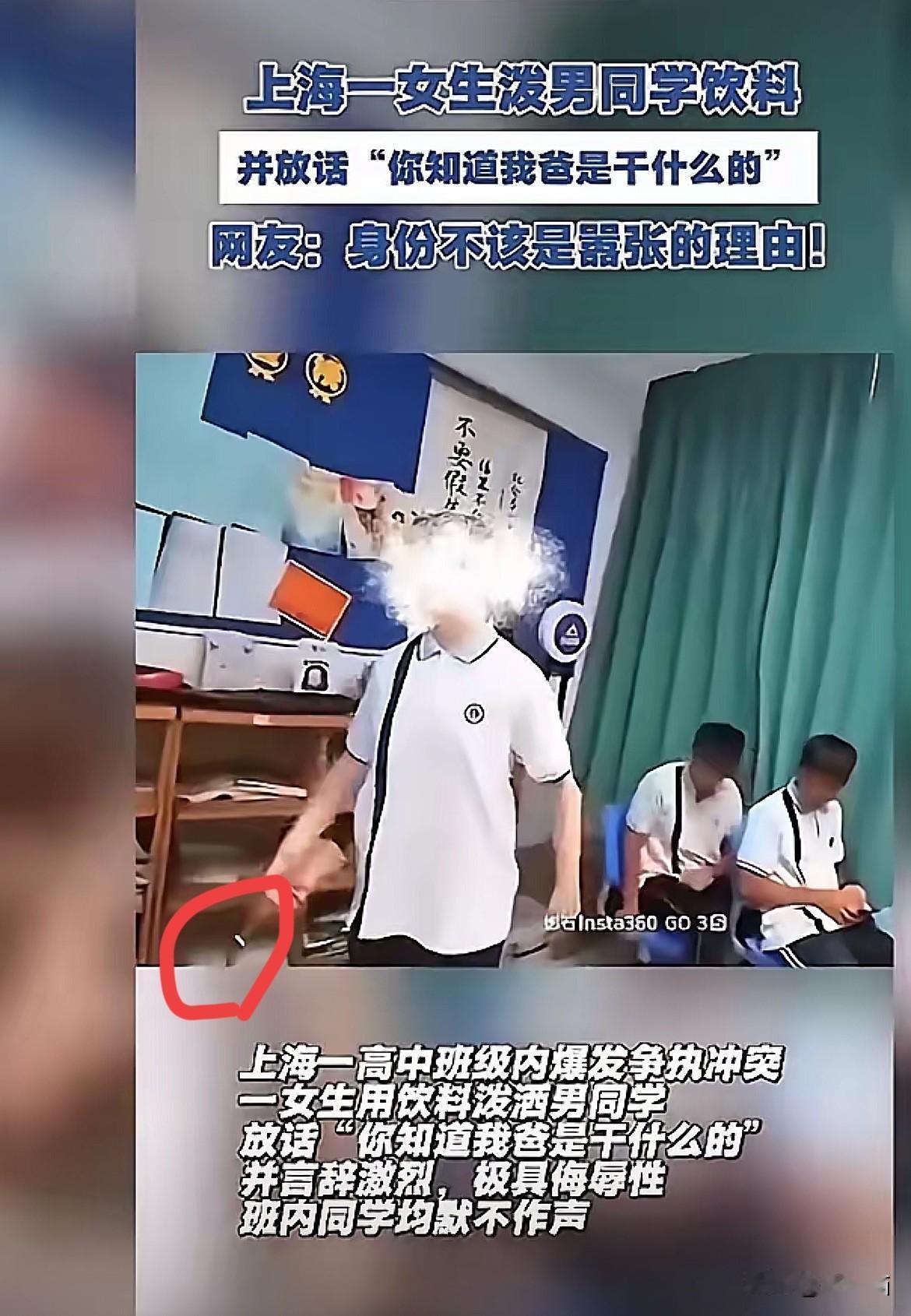 她爸到底是干啥的? 能让上海这女生敢当众往男生脸上泼可乐,还一脸嚣张地拿爹当“护身符”! 周围同学的反应更让人膈应, 男生被欺负时全都装没看见, 等男生忍无可忍锁喉反击, 立马跳出来拉偏架, 对着男生吼“你想干嘛”—— 合着他们早知道这女生的爹“不一般”, 才这么看人下菜碟? 其实真不是她爹多厉害, 是这女生把“拼爹”当底气, 把没教养当嚣张, 同学也跟着丢了是非观。 要是真有底气,就别拿爹说事