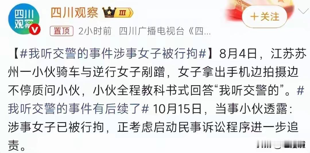 我听交警的,这句话说的太对了!江苏苏州男子骑车与逆行女子发生刮蹭,你只拿出手机拍摄,并且不断的质问男子男子教科书式回答,我听交警的。 现在这件事情已经有了最新的进展了,据小伙子说,这位女子已经被行政拘留小伙子正准备对女子提起民事诉讼。女子本来是想通过拍视频质问的方式让小伙子承认自己的“错误”,但是却没有想到碰到宁死不屈的人,女子非但没有碰瓷成功,反而被瓷所伤!这给所有的女拳主义提了个醒,做人不要太过分了!
