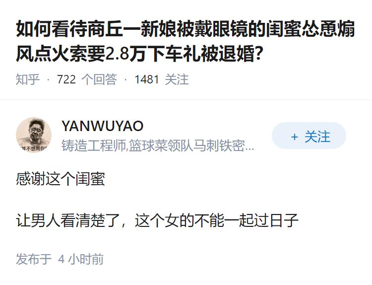 如何看待商丘一新娘被戴眼镜的闺蜜怂恿煽风点火索要2.8万下车礼被退婚?