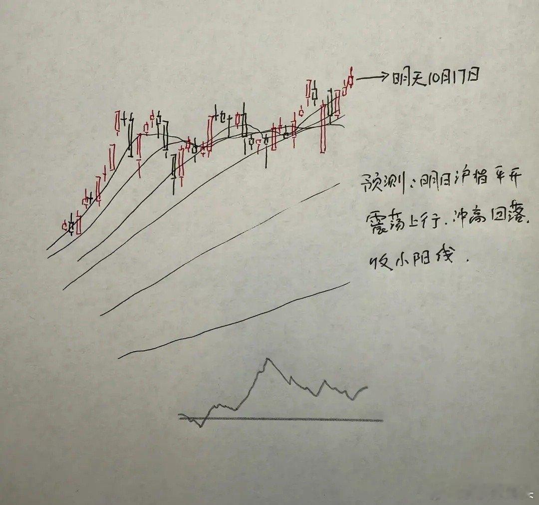 所以,综合以上分析,个人认为明天市场指数或者还能再往上走一天。明天上证指数走出冲高回落的小实体阳线的概率相对比较大。那么明天A股到底怎么走?大家请看图三关于明天走势的手绘预测图