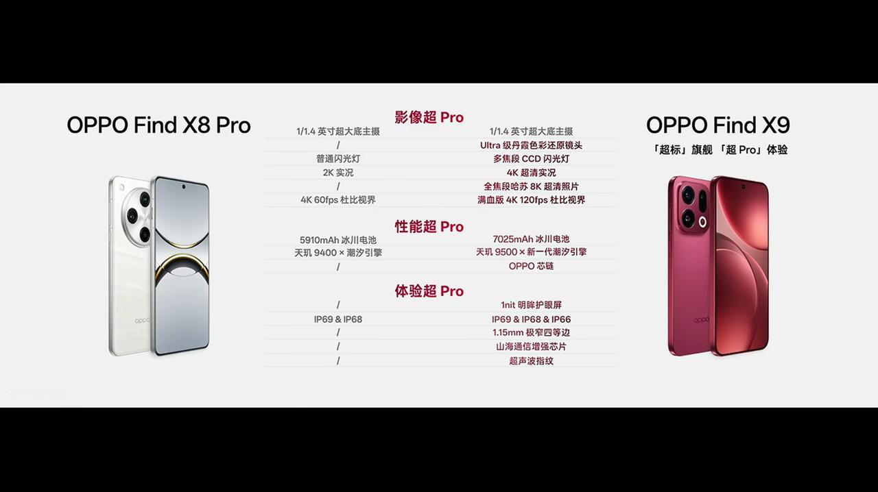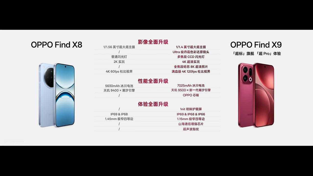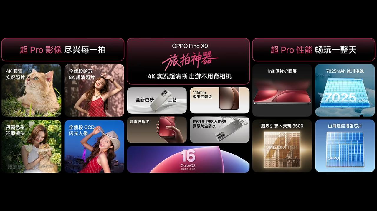 OPPO Find X9 发布,12+256GB 售价 4399 元、16+256GB 售价 4699 元、12+512GB 售价 4999 元、16+512GB 售价 5299 元、16GB+1TB 售价 5799 元。 - 芯片:联发科天玑 9500 芯片,LPDDR5X 内存,UFS 4.1 闪存,山海通信增强芯片、OPPO 自研 P3 显示芯片; - 屏幕:6.59 英寸 2760×1256 OLED 天马 OLED 直屏,全局激发亮度 1800nit,20% 窗口峰值亮度 3600nit,最低 1nit 亮度,支持 120Hz 刷新率,240Hz 触控采样率,3840Hz 高频 PWM 调光,支持 10.7 亿色,OPPO 晶盾玻璃,1.45mm 极窄边框; - 相机:前置 32MP(索尼 IMX615,1/2.74"),后置 50MP 主摄(索尼 LYT-808,1/1.4",OIS)+ 50MP 超广角(三星 S5KJN5,1/2.75")+ 50MP 倒置潜望长焦(索尼 LYT-600,1/1.95",OIS)+ 丹霞色彩还原镜头,变焦闪光灯,支持 4K 超清实况照片、哈苏 XPAN、4K 120fps 10bit log 视频拍摄,全新「霓虹」胶片风格模拟; - 续航:7025mAh 冰川电池(OPPO 自研第四代硅碳负极材料),支持 80W 快充,50W 无线充电、5W 无线反向充电; - 其他:追光红、绒光钛、雾黑、霜白 4 款配色,厚 7.99mm,重 203g,OPPO 晶盾玻璃后盖,支持 Wi-Fi 7、NFC、红外遥控、超声波指纹识别,支持 IP66 & IP68 & IP69 防尘防水,配备超线性双扬声器、四麦克风、三重 Wi-Fi 天线系统、X 轴线性马达,搭载 ColorOS 16 系统。