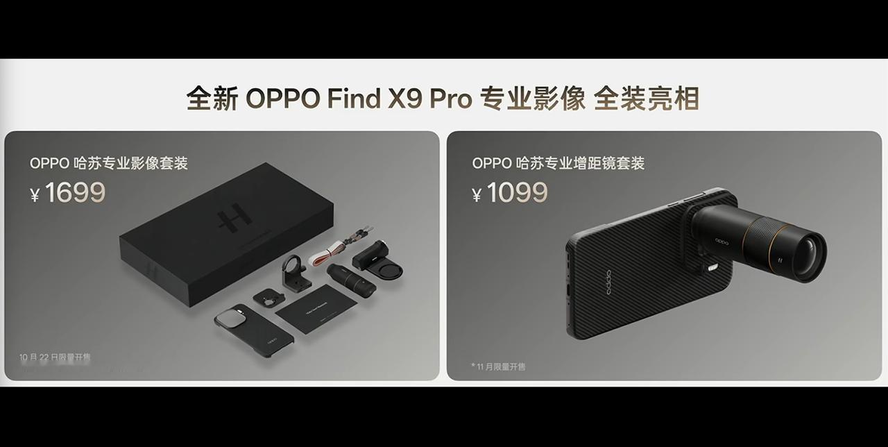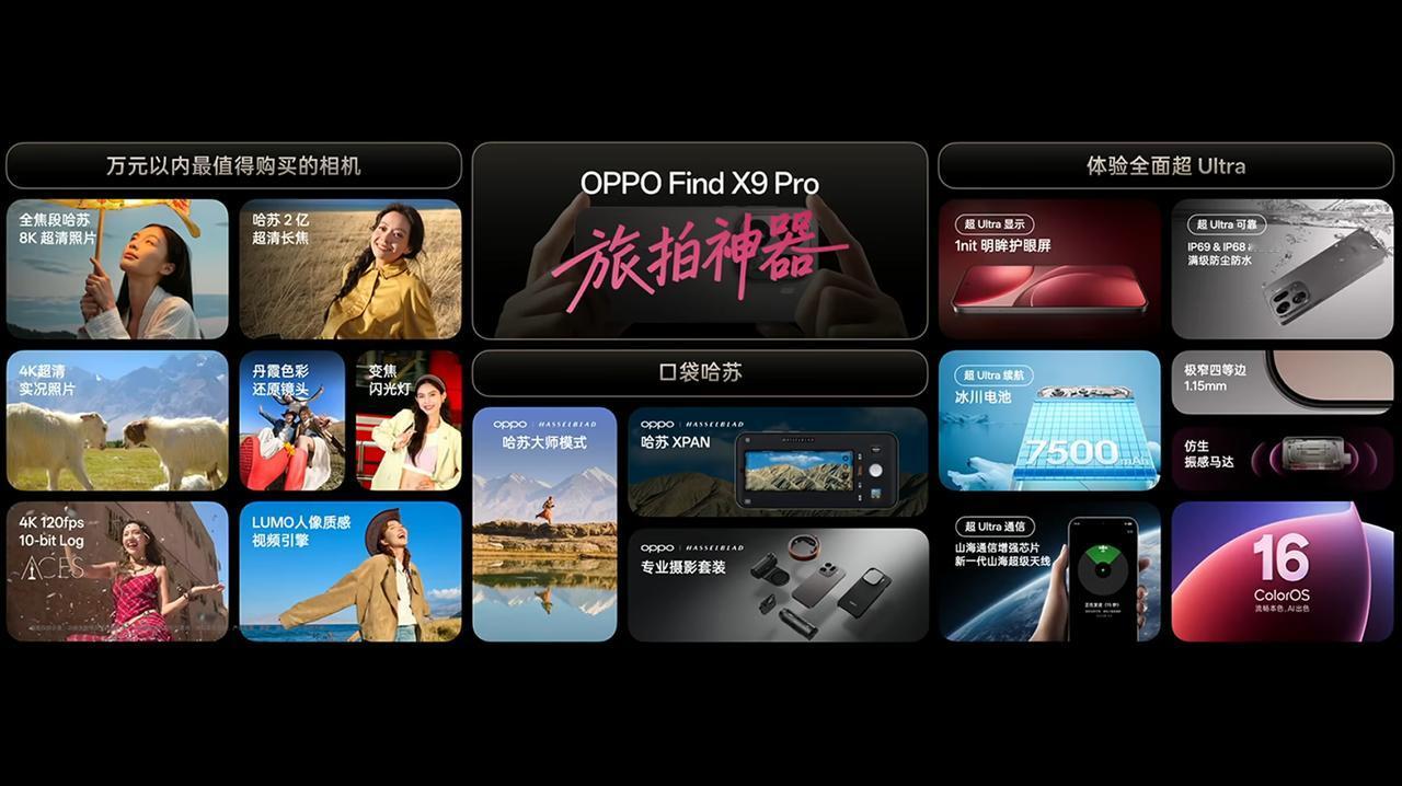 OPPO Find X9 Pro 发布,12+256GB 售价 5299 元、12+512GB 售价 5699 元、16+512GB 售价 5999 元、16GB+1TB 售价 6699 元。1TB eSIM 卫星通信版将在 11 月开售。OPPO 哈苏专业影像套装售价 1699 元(10.22 开售)、OPPO 哈苏专业增距镜台装售价 1099 元(11 月开售),这个价格怎么样? - 芯片:联发科天玑 9500 芯片,LPDDR5X 内存,UFS 4.1 闪存,山海通信增强芯片、OPPO 自研 P3 显示芯片; - 屏幕:6.78 英寸 2772×1272 OLED 天马 OLED 直屏,全局峰值亮度 1600nit、局部峰值亮度 3600nit,支持 120Hz 刷新率(8T LTPO 1-120Hz 自适应),240Hz 触控采样率,Hz 高频 PWM 调光,支持 10.7 亿色,OPPO 晶盾玻璃,1.15mm 四窄边; - 相机:前置 50MP(三星 S5KJN5,1/2.75"),后置 50MP 主摄(索尼 LYT-828,1/1.28",OIS)+ 50MP 超广角(三星 S5KJN5,1/2.75")+ 200MP 潜望长焦(三星 S5KJN5,1/1.56",OIS)+ 丹霞色彩还原镜头,变焦闪光灯,支持 4K 超清实况照片、哈苏 XPAN、4K 120fps 10bit log 视频拍摄,全新「霓虹」胶片风格模拟; - 续航:7500mAh 冰川电池(OPPO 自研第四代硅碳负极材料),支持 80W 快充,50W 无线充电、5W 无线反向充电; - 其他:追光红、绒砂钛、霜白 3 款配色,厚 8.25mm,重 224g,,OPPO 晶盾玻璃后盖,支持 Wi-Fi 7、NFC、红外遥控、超声波指纹识别,支持 IP66 & IP68 & IP69 防尘防水,配备超线性双扬声器、四麦克风、三重 Wi-Fi 天线系统、X 轴线性马达,搭载 ColorOS 16 系统。
