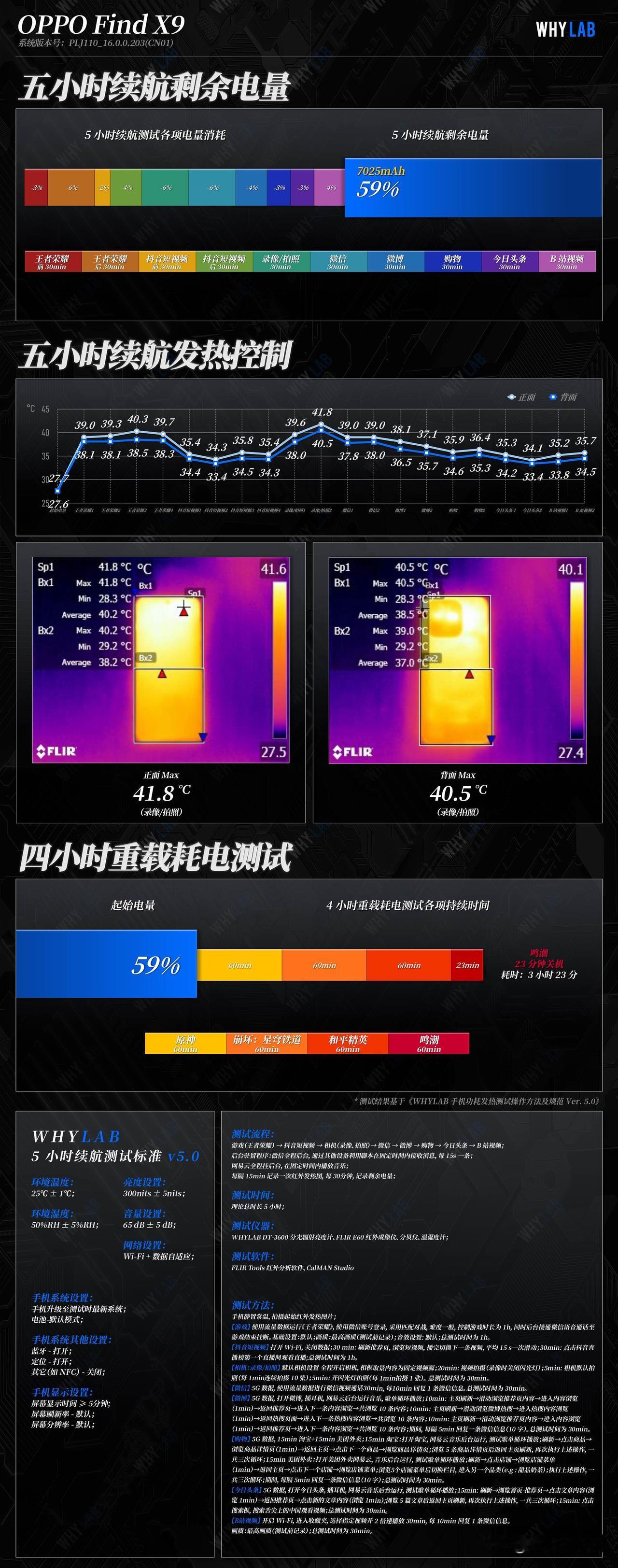 新增 OPPO Find X9 标准版续航数据 OPPO 这次比较反常识的在一块 6.59 英寸 7.99mm 厚的直板机身里塞下了一块 7025mAh 大电池,非常夸张。 实测 5 小时续航剩余电量 59%,测到死续航 8 小时 23 分钟,在这块 7K+ 大电池加持下,Find X9 日常续航体验非常好,电量一天根本用不完,可以不再需要充电宝了。 充电方面,依旧是熟悉的 80W 有线快充和 50W 无线快充,实测 80W 有线充电 100% 耗时 72 分钟,相对续航表现,充电表现显得中规中矩了,希望 OPPO 下一代能提一提充电速度。[灵光一闪]
