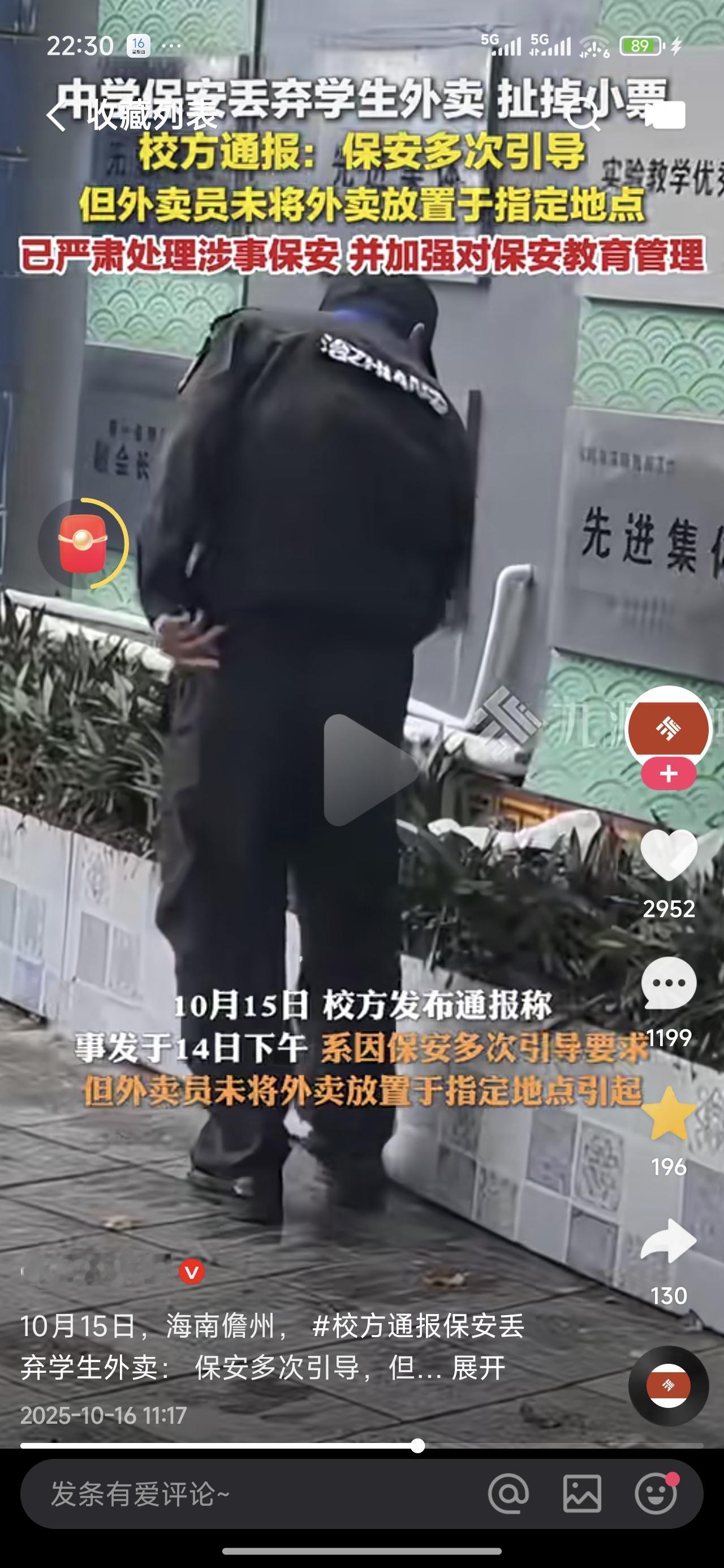 这件事我是这样理解的:1、作为一个保安,不太可能那么嚣张,不太可能扔掉那么多外卖,大概率是学校方面授意;2、一所中学,不应该有食堂的吗?3、中学生就这么疯狂吃外卖,真的真的真的对身心健康极为不利;4、大家都知道是学校的意思,但终究是保安扛起了所有。 中学保安丢弃学生外卖