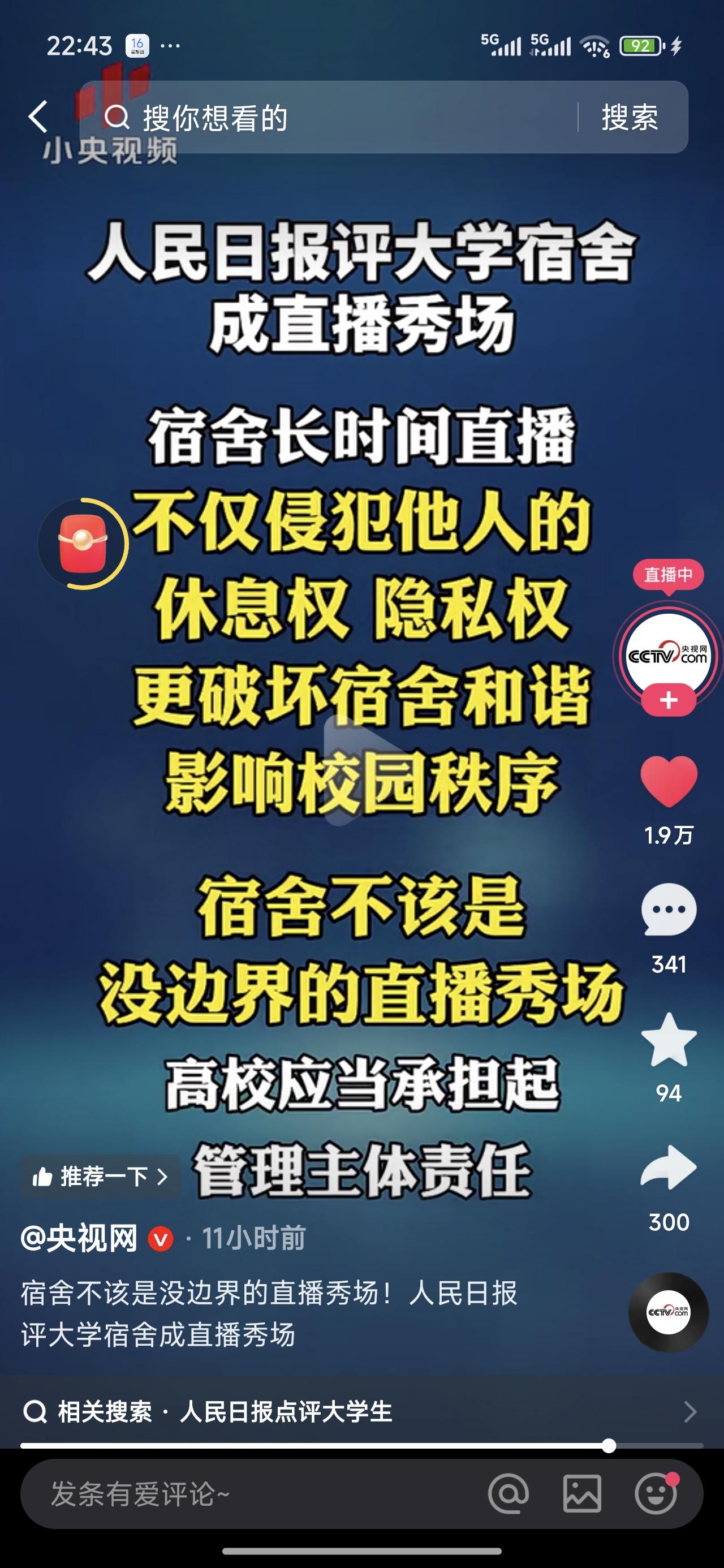 造成这种现象的原因可能有很多,1、社会上功利化的直播秀、短视频赚钱的风气进入校园,对大学生身心造成极大诱惑;2、社会、学校对大学生行为准则、职责没有形成公认且明确的规范,大学生缺乏边界感;3、学校的日常教育、监管缺位;4,大学生自身方面的因素。 虽然说大学教育不能脱离社会,但是还是希望社会上的不良风气不要侵扰、污染了大学校园。大学生直播 宿舍直播 网络直播危害 年轻人直播文化