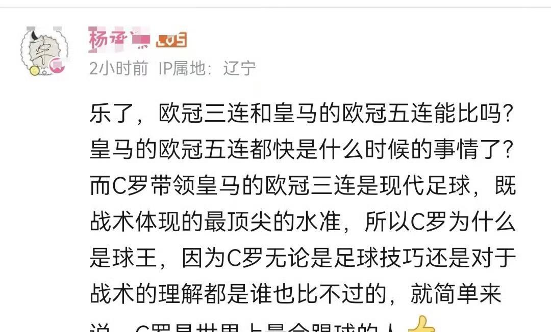 “C罗连续5届欧冠冠军”,罗粉这都不是偷了,明火执仗抢劫啊。口口声声看不上迪斯蒂法诺的欧冠五连,说什么含金量低,回过头来就把欧冠五连按在主子头上。然后又污蔑梅西靠裁判和普拉蒂尼撑腰。 罗粉真的是恨死了阿根廷人,他们把主子压的死死的。也难怪C罗本人要找个阿根廷女人乔治娜,他也可以把阿根廷人压的死死的。