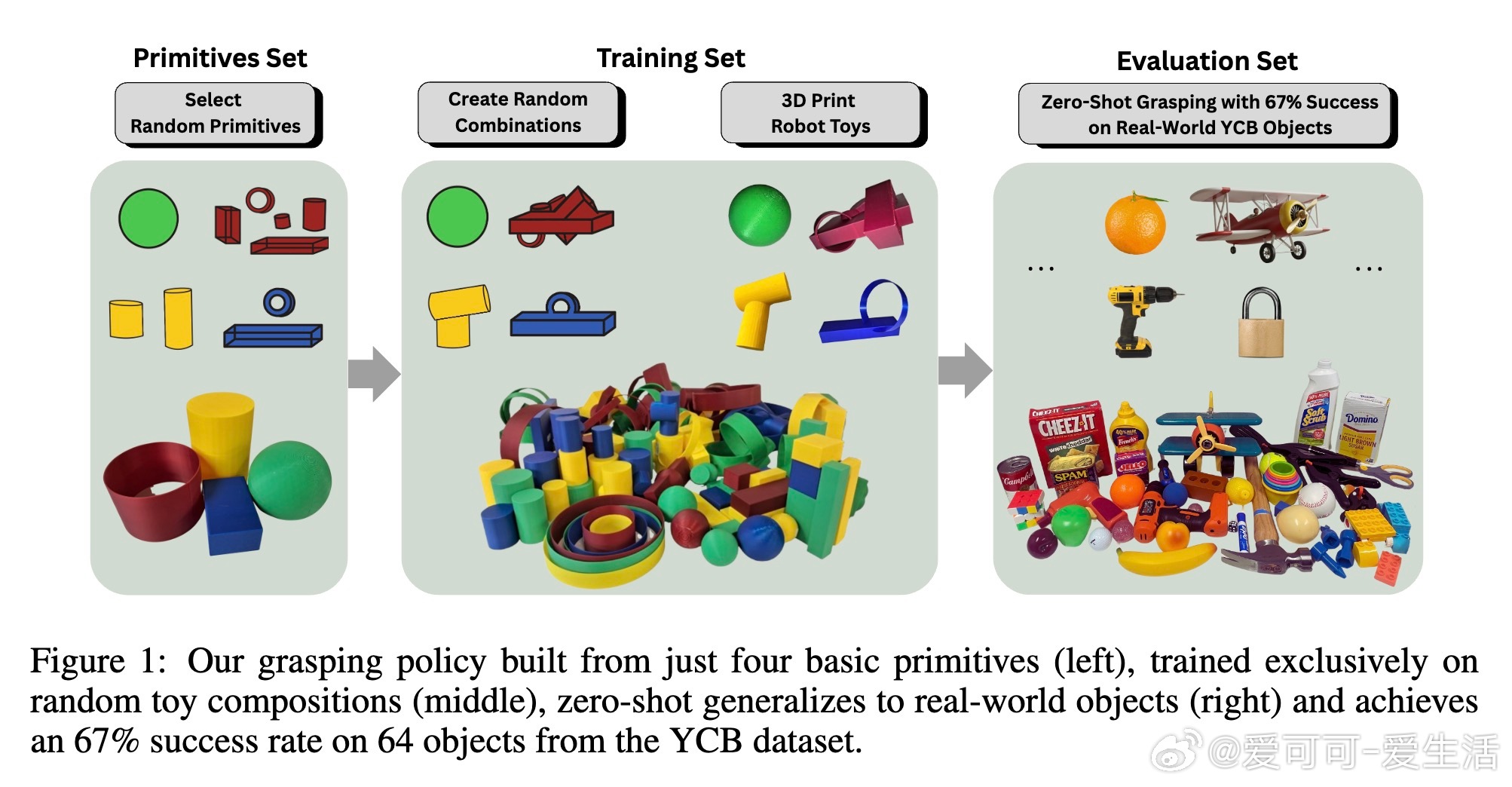 该工作为机器人操作的可扩展泛化学习开辟了新路径,表明从少量基础形状构成的随机组合物体中学习,配合面向对象的视觉表征,足以实现对复杂真实物体的有效抓取。