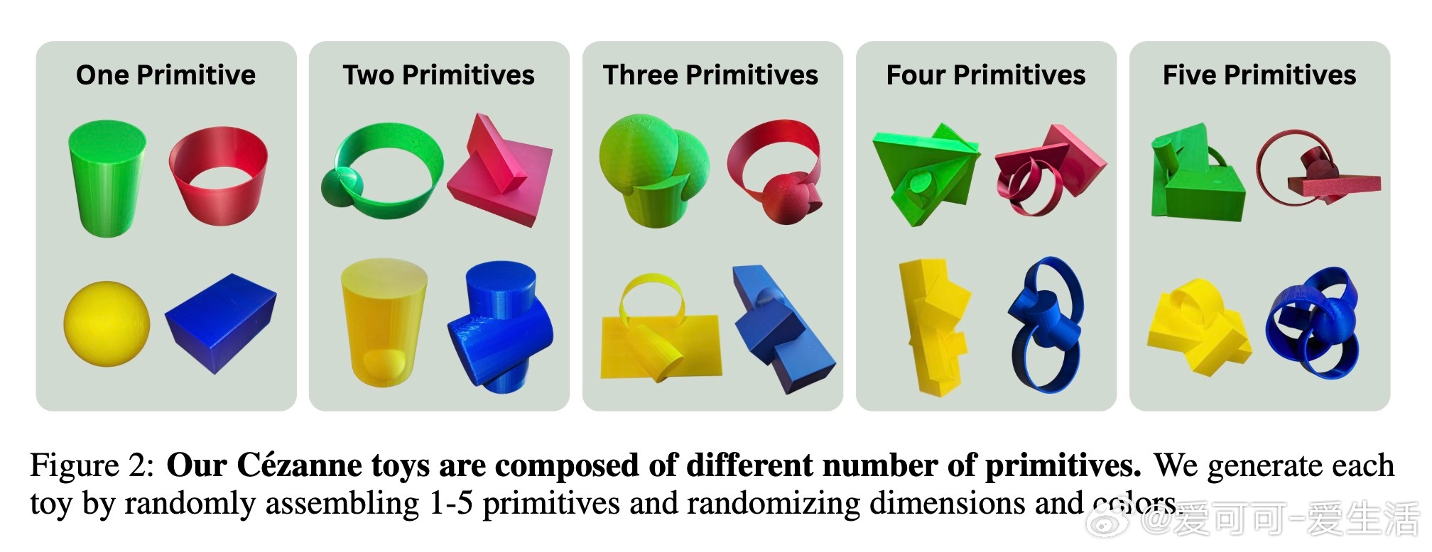 核心思想源自认知科学:儿童通过掌握少量简单玩具的操作,发展出泛化的灵巧操作技能。受此启发,研究团队设计了由四种基本形状(球体、长方体、圆柱体和环形)随机组合而成的“塞尚玩具”(Cézanne toys),用于训练机器人抓取策略。