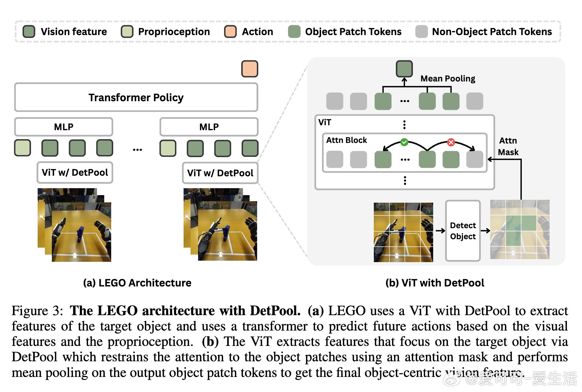 关键创新是引入“检测池化”(Detection Pooling,DetPool)机制,通过目标物体的分割掩码引导视觉编码器聚焦物体区域,剔除背景干扰,生成面向对象的视觉表征。这种表征极大提升了模型在训练与测试对象差异巨大的情况下的零样本泛化能力。