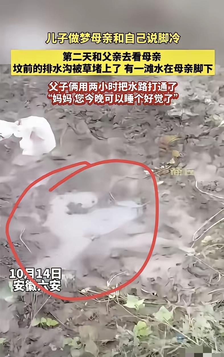 “这下真的解释不清了!”安徽六安这事儿,看完我鼻子都酸了——儿子梦到妈妈说“脚冷”,第二天就拉着爸爸去坟地,居然真发现坟脚积了水! 好多人说这是母子连心,多神奇。可我觉得,哪是梦神奇啊?是儿子把妈妈的话往心里去了。换作别人,可能一笑而过,说就是个梦,他却当真了,立马去清理排水沟,干了俩小时不嫌累。 这份孝顺从来不是做给别人看的,是刻在骨子里的惦记。人走了,牵挂没断,更难得的是愿意为这份牵挂实实在在动手。 你们有没有过那种,心里突然记挂着谁,然后立马去做件小事的时刻?那时候的心情,是不是特别踏实?