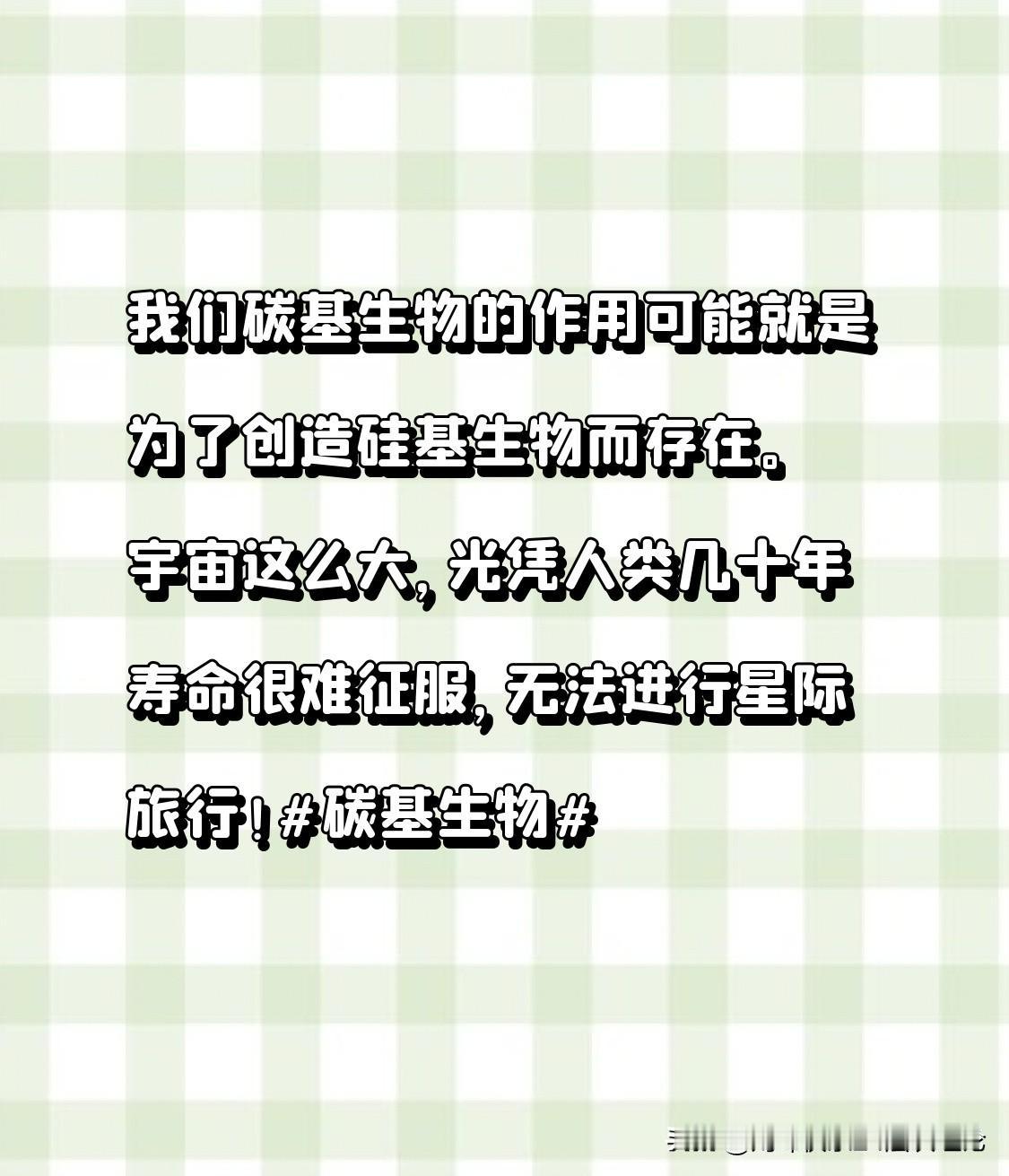 我们碳基生物的作用可能就是为了创造硅基生物而存在。宇宙这么大,光凭人类几十年寿命