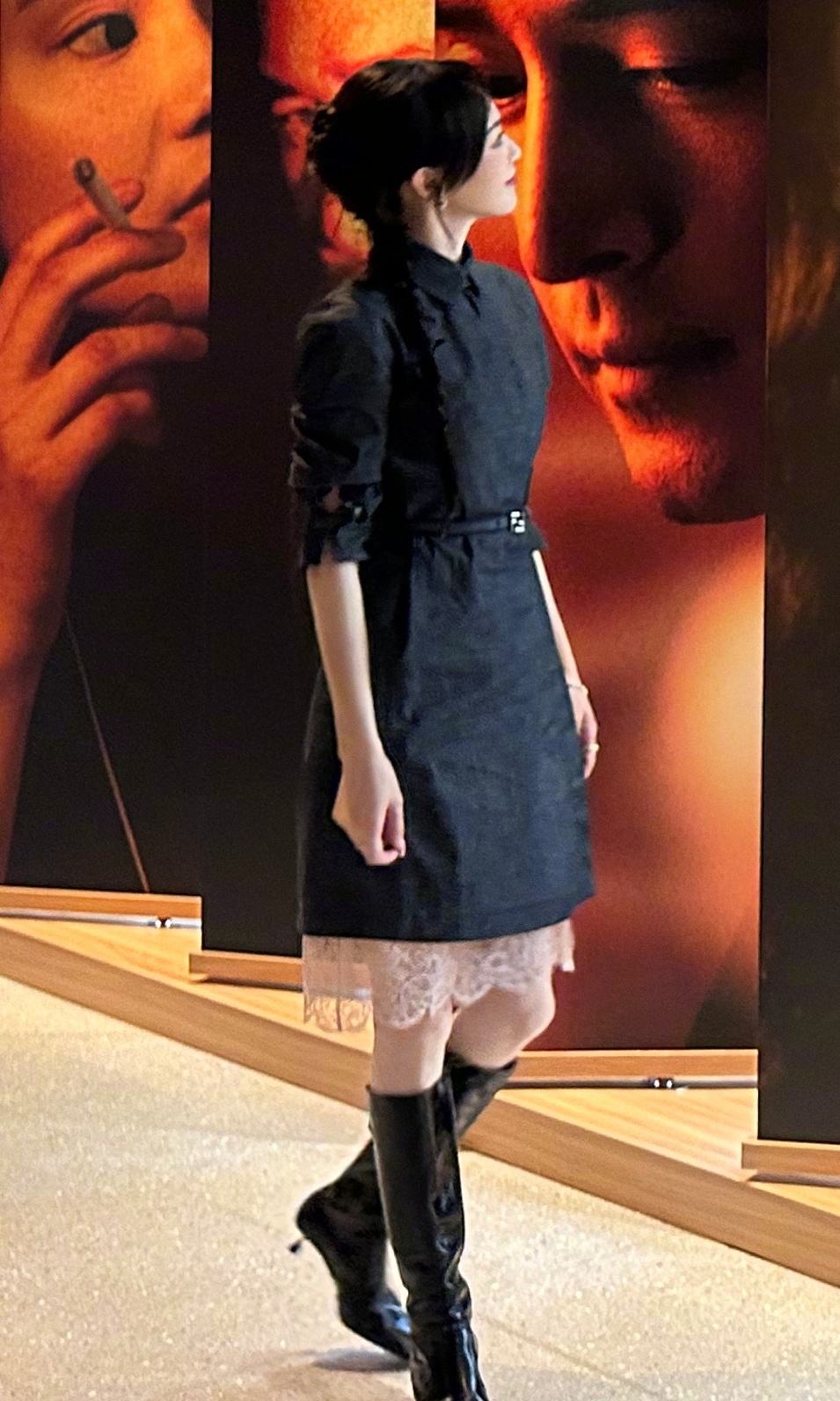 46岁章子怡带一对子女现身日本,去看韩国女团的演唱会,她穿着一条薄纱连体衫,身材