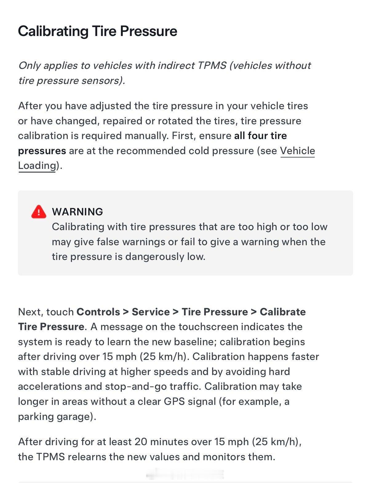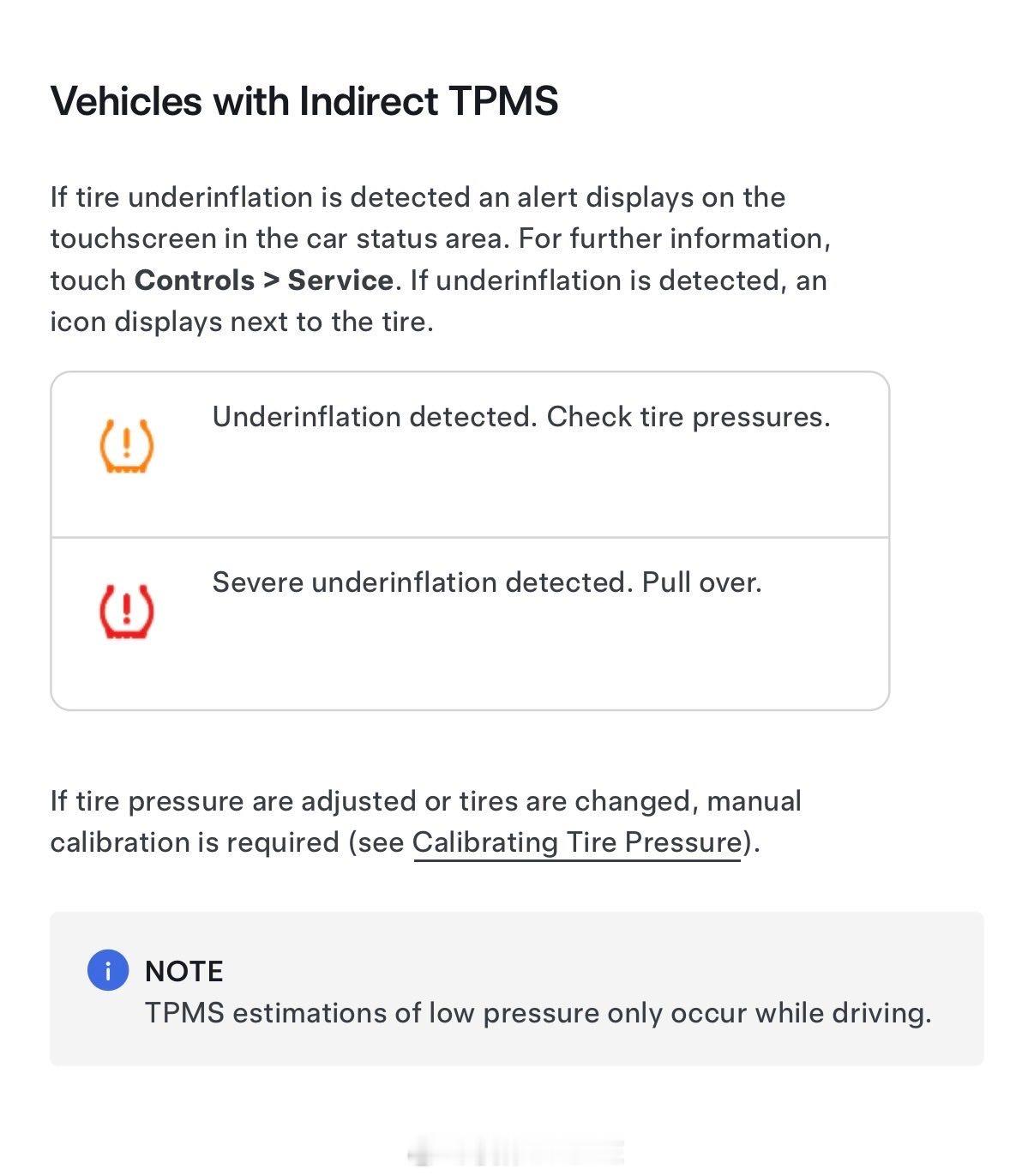 车辆现在使用间接 TPMS,通过比较车轮速度来检测低压,调整轮胎压力或更换轮胎后必须重新校准系统。