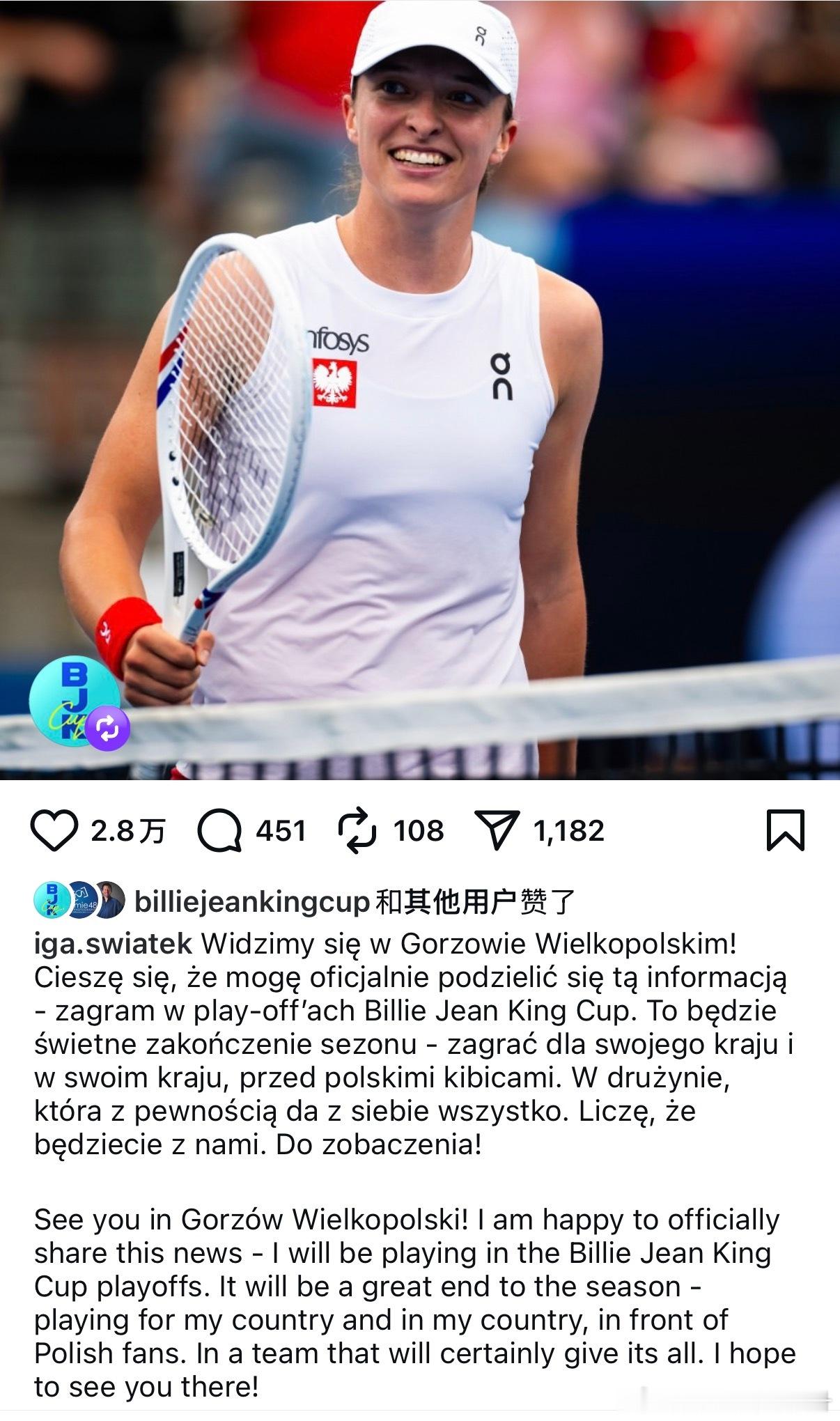 🇵🇱斯瓦泰克将参加比利简金杯世界组附加赛