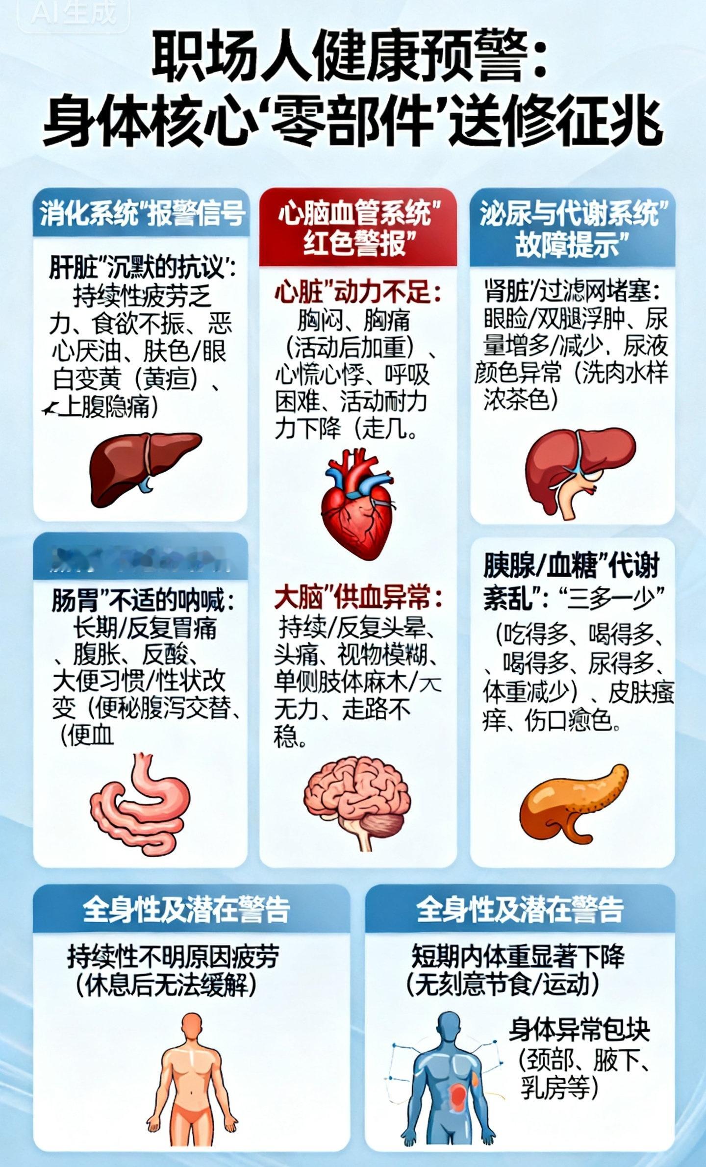 以下是身体核心“零部件”发出的一些常见“送修”征兆,值得您高度警惕: