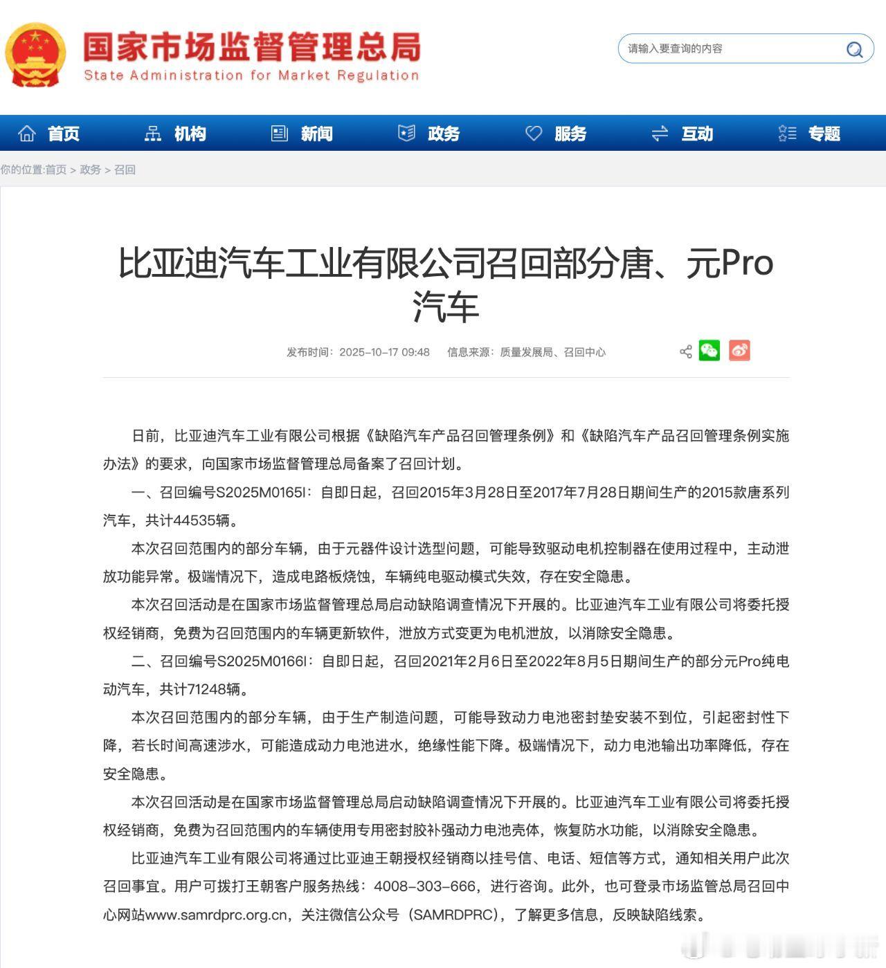 - 召回编号 S2025M0165I:即日起,召回 2015 年 3 月 28 日至 2017 年 7 月 28 日期间生产的 2015 款唐系列汽车,共 44535 辆。
