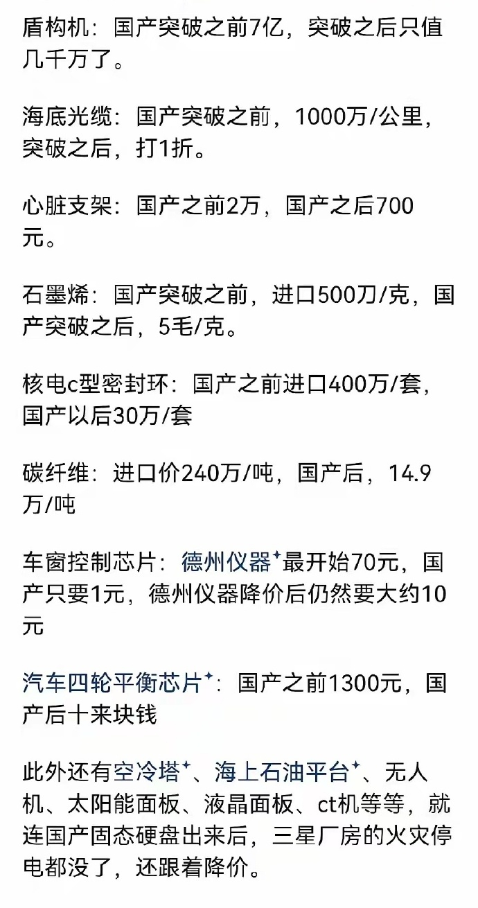 依靠国家层面的战略布局协作、以及庞大的高质量人口,工程师红利,通过自主研发实现技术开源化和国产化。这个过程本身就是将技术扁平化、透明化、普适化的过程。让信息差消失,价格回归。