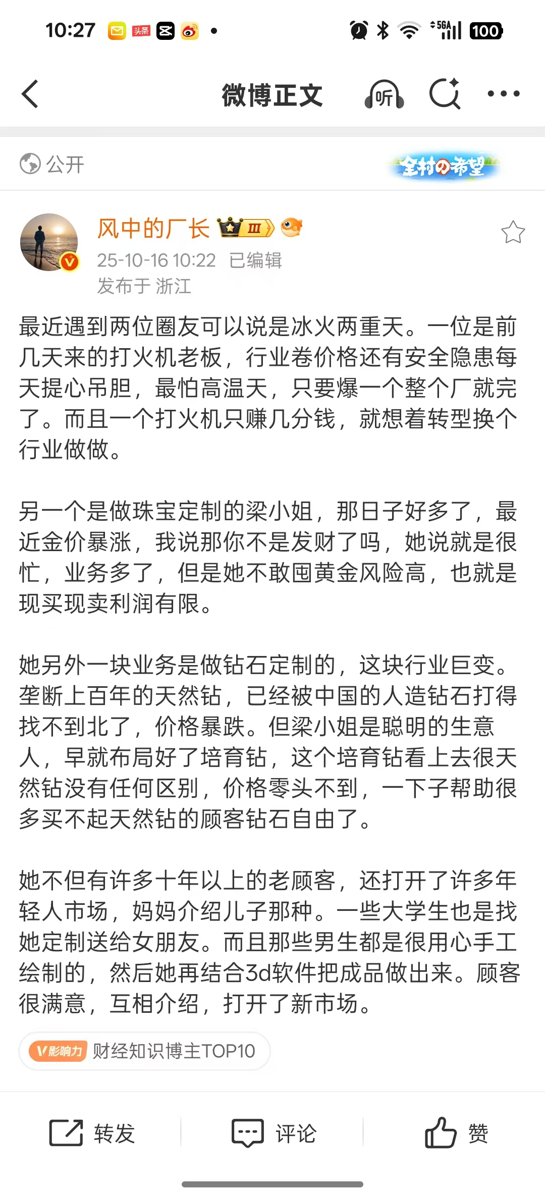 用人造钻石布局生意的,打破大集团资源垄断。宝石价格变得透明,消费者不再为营销出来的稀缺性买单。