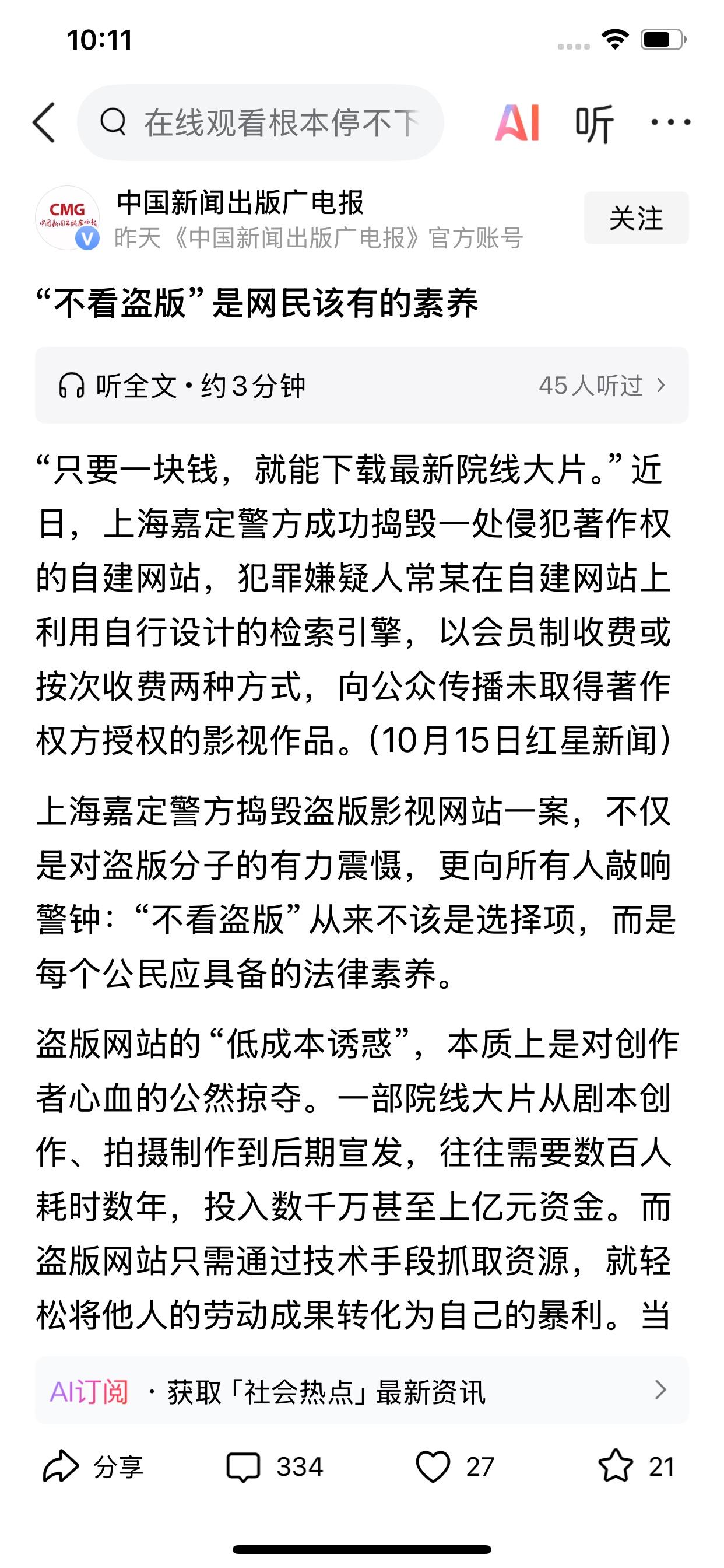 “不看盗版”从来不该是选择项,而是每个公民应具备的法律素养。这句话没有毛病,“盗
