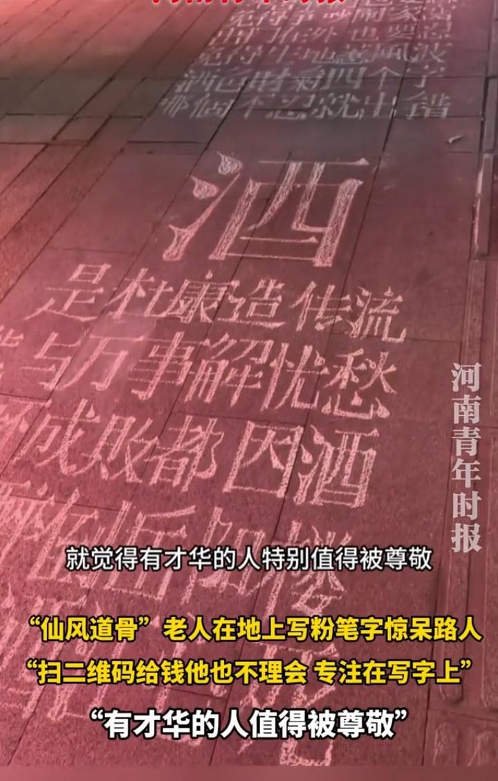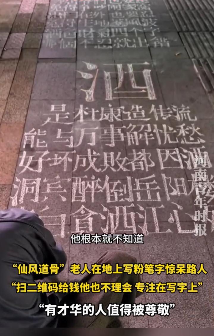 近日河南郑州,一36岁女子在等火车时闲逛,突然,被眼前一个坐在地上的白发老人吸引住了,赶紧走过去看! 女子闲逛时看见一个白发老人坐在地上,用粉笔在地上写字,写的粉笔字很工整很好看,再加上老人一头白发,有种仙风道骨的感觉,老人旁边有个二维码,有人给他打赏也不理会,专注地写着粉笔字,看得出来这是一个很有才华的老人!