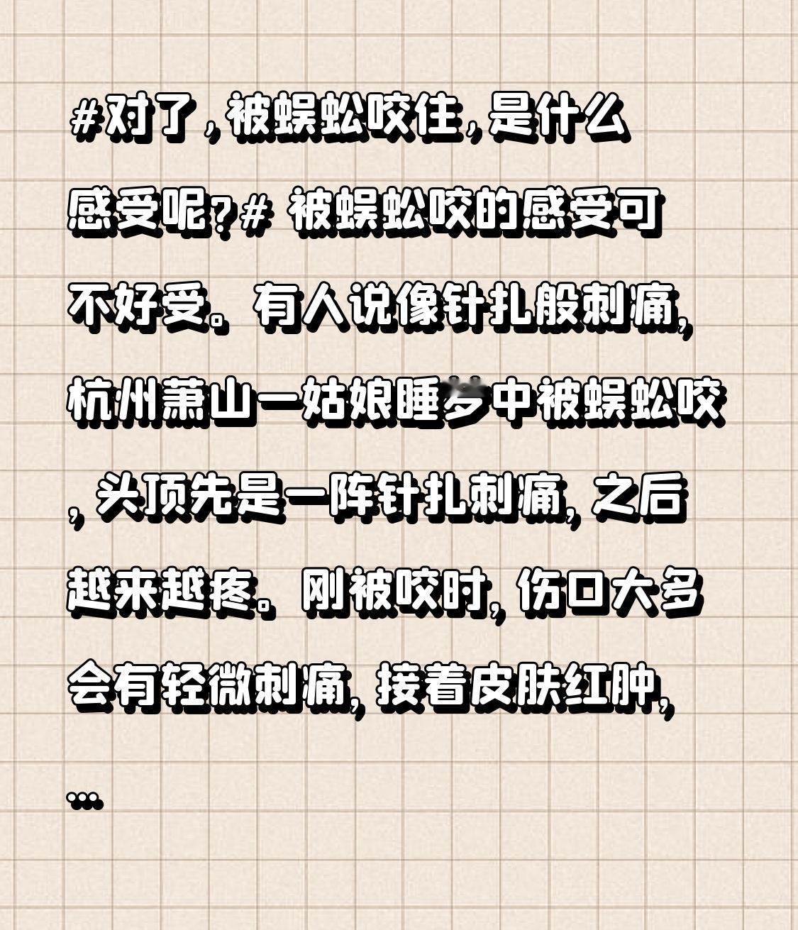 对了,被蜈蚣咬住,是什么感受呢? 被蜈蚣咬的感受可不好受。有人说像针扎般刺痛,杭州萧山一姑娘睡梦中被蜈蚣咬,头顶先是一阵针扎刺痛,之后越来越疼。 刚被咬时,伤口大多会有轻微刺痛,接着皮肤红肿,这是身体对毒液的反应。毒液渗透后,被咬处会瘙痒、灼热,像有火在烧。随着时间推移,疼痛加剧、肿胀扩大,甚至影响关节活动。部分敏感人群还会有全身症状,如发热、头痛、恶心等,极少数会引发严重过敏反应。萧山医院一天曾接两例患者,一位手背被咬,肿胀疼痛麻木;一位足底被咬,疼痛难忍。所以,蜈蚣活跃期可得多注意!