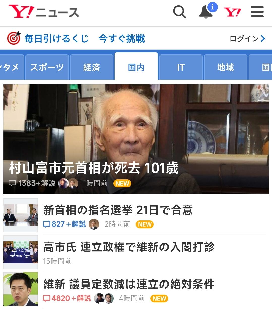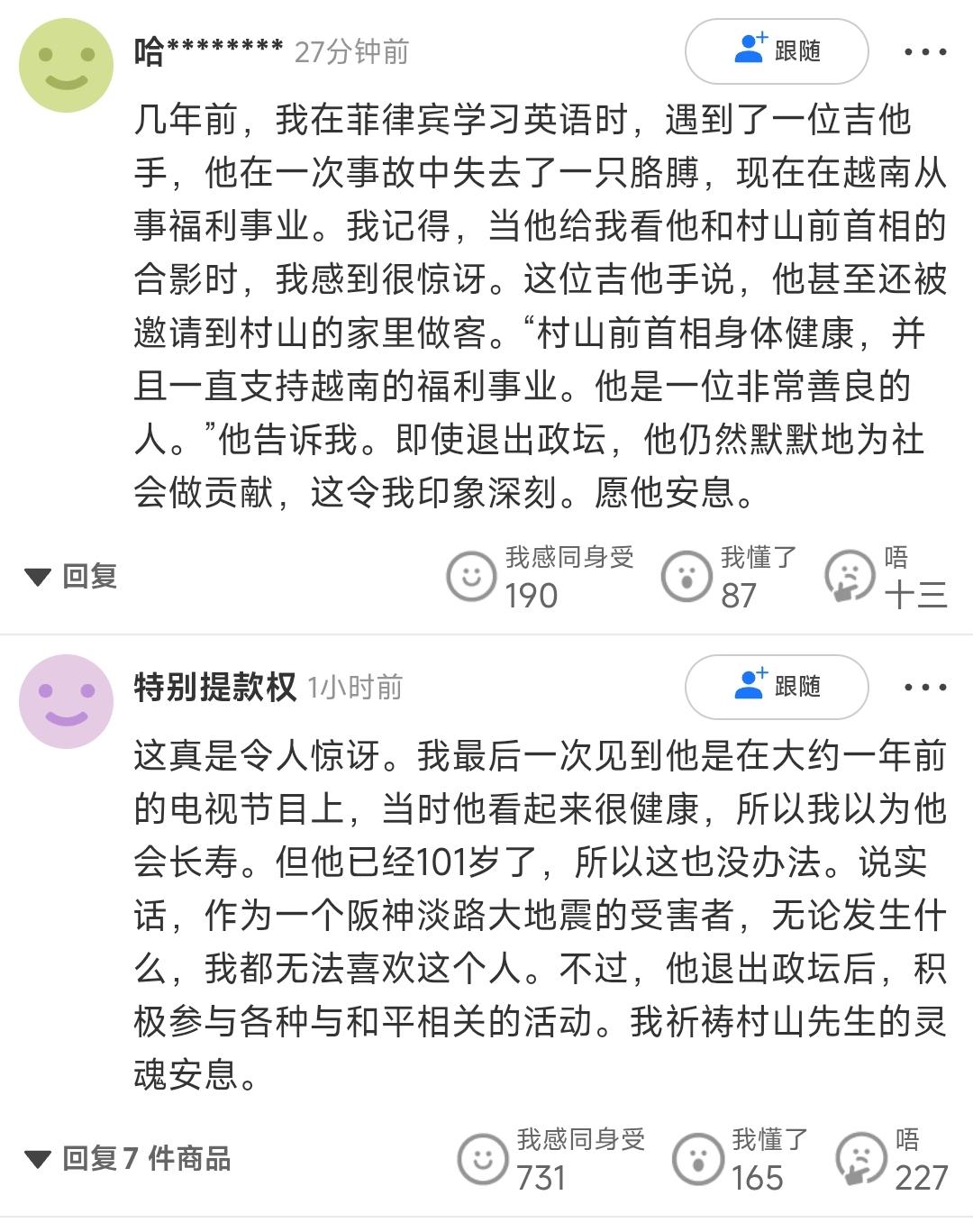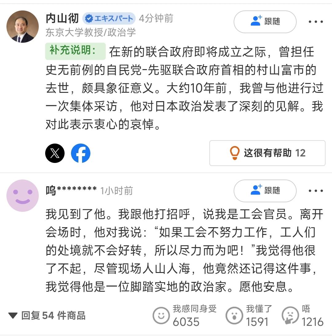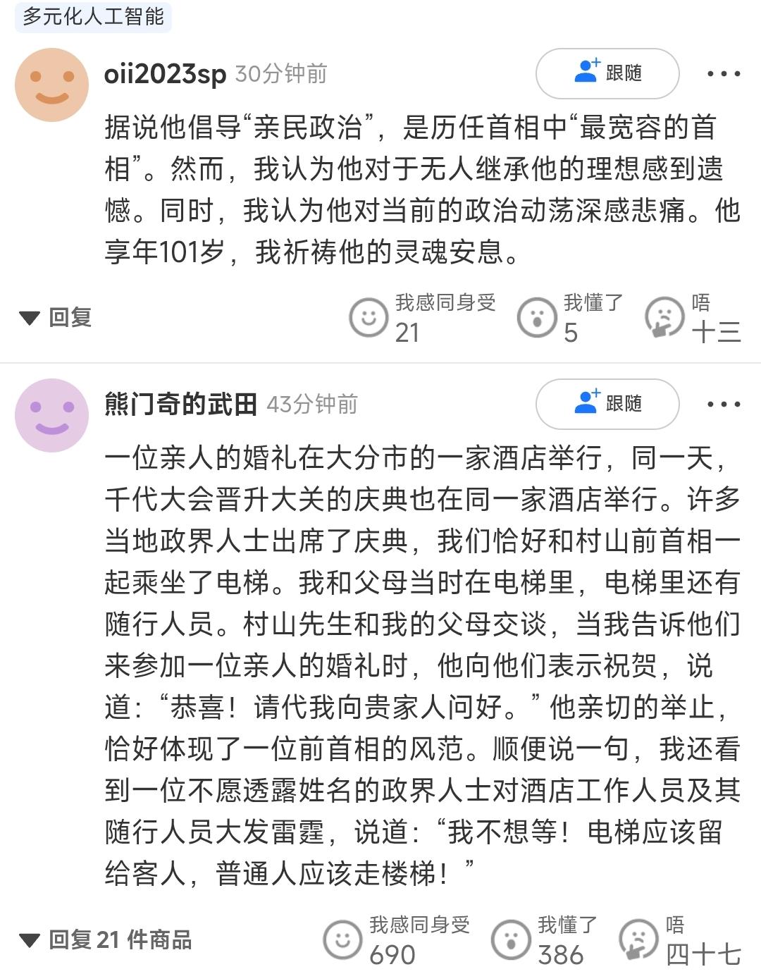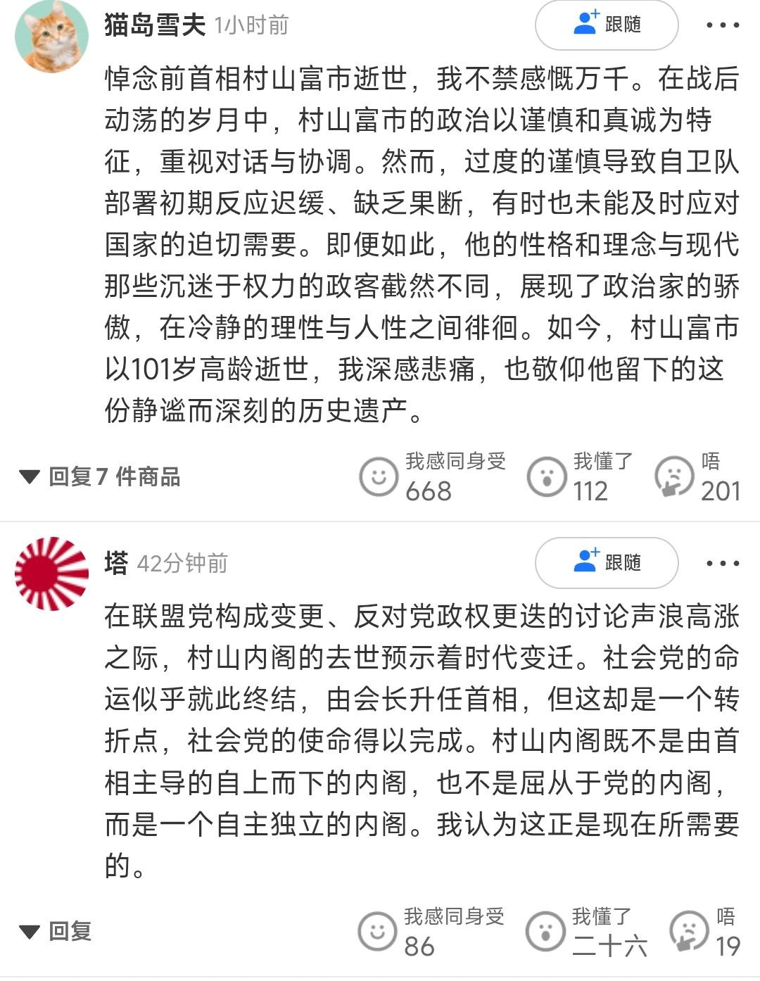 10月17日,日本前首相村山富市去世了,他由于当年为二战侵略道歉的“村山谈话”,而在中国享有盛名。不过我所感兴趣的是,日本社会到底怎么看他?说实话,这个结果还是令我颇感意外的。 首先,日本媒体也高度重视这个新闻,无论是日本雅虎的首页,还是社交媒体上的热搜,村山富市去世的新闻都占据了头条。这既与村山富市的首相身份有关,也与当年村山所领导的社会党与自民党组成联合政权有关。这与当下日本首相选举之前的政治乱局相呼应。 其次,虽然村山富市当年为了二战侵略向亚洲国家道歉,但从我所看到的日本网友评论来看,对他几乎是一面倒的尊重与喜爱。其原因,似乎并不在于他的政治观点和立场,而是在于他作为一个政治家的品行与操守。日本网友对他的评论几乎都是平易近人,热爱公益事业,不滥用职权,不贪恋权力等等。一位日本网友回忆到,当年曾经和村山一起共乘过酒店的电梯,这与当下“专梯专用”的日本政客形成了鲜明的对比。更不用说已经和金钱政治脱不开干系的自民党了。 因此可以说,村山富士的去世引发了日本社会的集体哀悼与怀念。一方面,村山慈眉善目的形象,标志性的眉毛,以及多年持续不断的努力,真正展现出了对和平的向往追求。另一方面,日本人对他的追悼,也体现出了对当前自民党为代表的金钱政治和黑箱操作的不满。因此,也不排除村山的去世,会对在野党的团结以及即将到来的首相选举,带来一定的冲击和影响。