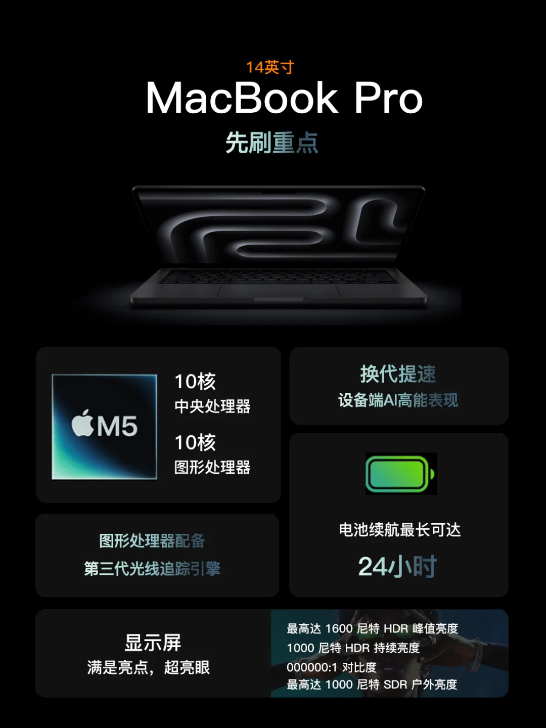 2025 年 10 月 15 号晚上,苹果终于放出了新的 M5 芯片。这玩意儿用的是第三代 3 纳米工艺,不管是算力还是效率,都比之前的型号升级了一大截。下面就用更接地气的说法,跟你聊聊 M5 芯片到底强在哪。 1. 性能参数:核心配置全拉满 CPU:最多能到 10 核,里面有 4 个专门负责飙速度的性能核,还有 6 个省电费的能效核。跟 M4 比,多线程处理速度最高能快 15%,多开软件、跑复杂任务更流畅。 GPU:全新的 10 核设计,每个核心都带了独立的 AI 加速单元。AI 计算能力比 M4 快 4 倍多,比 M1 更是直接翻了 6 倍;整体图形性能比 M4 高 30%,玩带光线追踪的游戏、做 3D 渲染,速度能再快 45%。 神经网络引擎:16 核的配置,算力达到 45TOPS,比 M4 提升了 50%,处理 AI 相关的任务更给力。 统一内存:带宽冲到了 153GB/s,比 M4 快近 30%,是 M1 的两倍还多,最高能装 32GB,加载大文件、多任务切换更跟手。 2. 技术亮点:不只是堆硬件 软件生态适配:M5 的 GPU 和苹果自家的软件框架绑得很死,用 Core ML、Metal 这些工具的 APP,打开就能直接享受到性能提升。开发者还能通过 Metal 4 的 Tensor API,自己调 AI 加速功能,定制专属的高效方案。 能效比能打:M5 没丢苹果芯片 “性能强还省电” 的传统,也是苹果 2030 年实现碳中和目标的一环。用在新的 MacBook Pro、iPad Pro 和 Apple Vision Pro 上,不仅速度更快,还能少耗点电。 搭载机型: 这次 M5 发布后,苹果直接更新了专业级设备,新的 14 英寸 MacBook Pro、iPad Pro 和 Apple Vision Pro,都能选装 M5 芯片。 购买时间: 10 月 17 号上午 9 点开始接受预订,10 月 22 号就能正式买到手了。