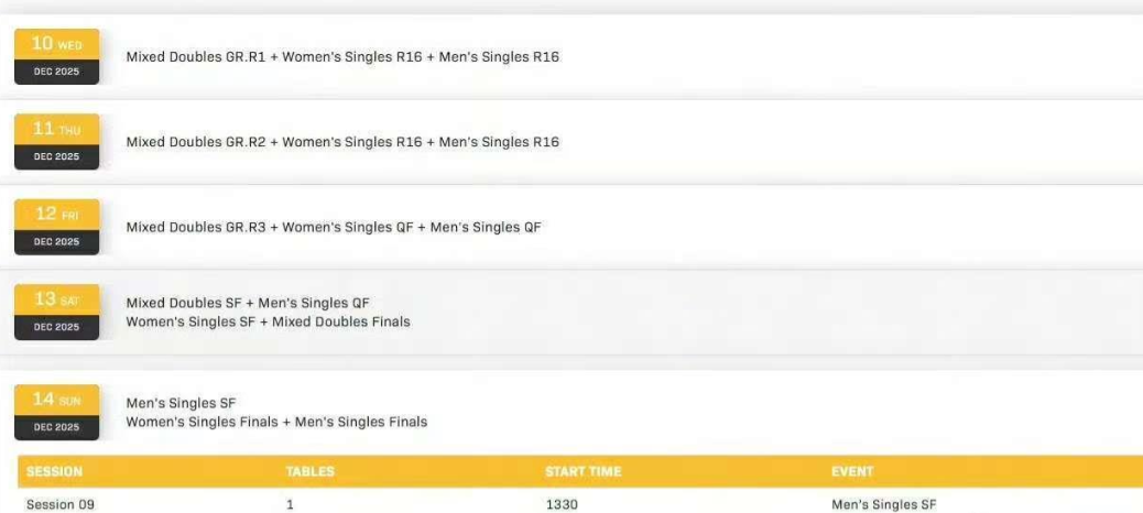 2025WTT香港总决赛赛程公布,比赛将于12月10日—14日在中国香港红磡体育馆进行,具体安排如下: 12月10日:混双小组赛第一轮,男、女子单打16强赛; 12月11日:混双小组赛第二轮,男、女子单打16强赛; 12月12日:混双小组赛第三轮,男、女子单打1/4决赛; 12月13日:混双半决赛,男单1/4决赛,女单半决赛,混双决赛; 12月14日:男单半决赛,男单、女单决赛。