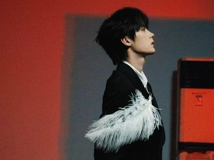 周翊然黑衣白羽周翊然黑衣白羽,周翊然见面会花絮照,黑色西装胸前一支白色