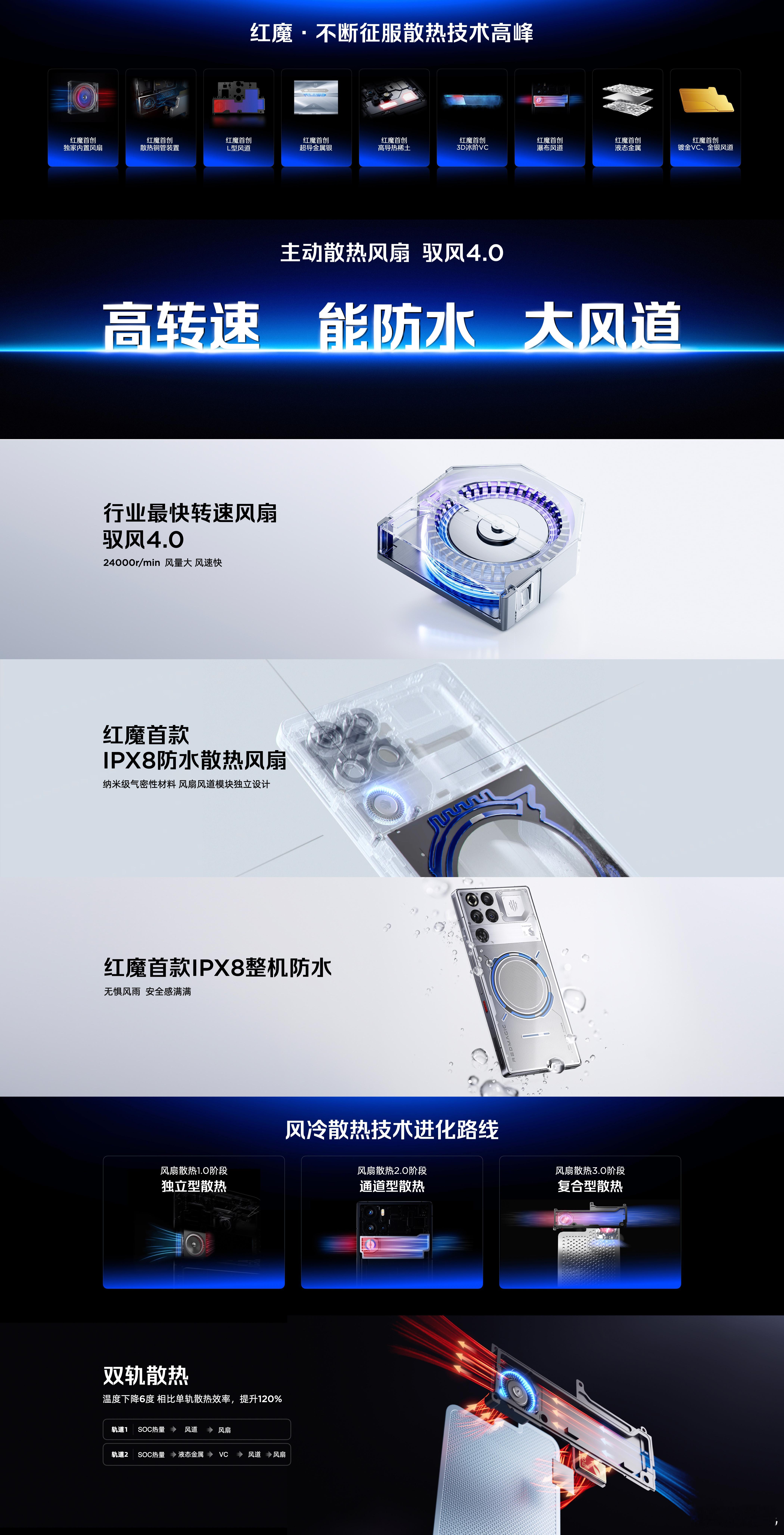 搭载「主动散热风扇 驭风4.0」,行业最快转速风扇,2400r/min,是红魔首款IPX8防水散热风扇,也是红魔首款IPX8整机防水。