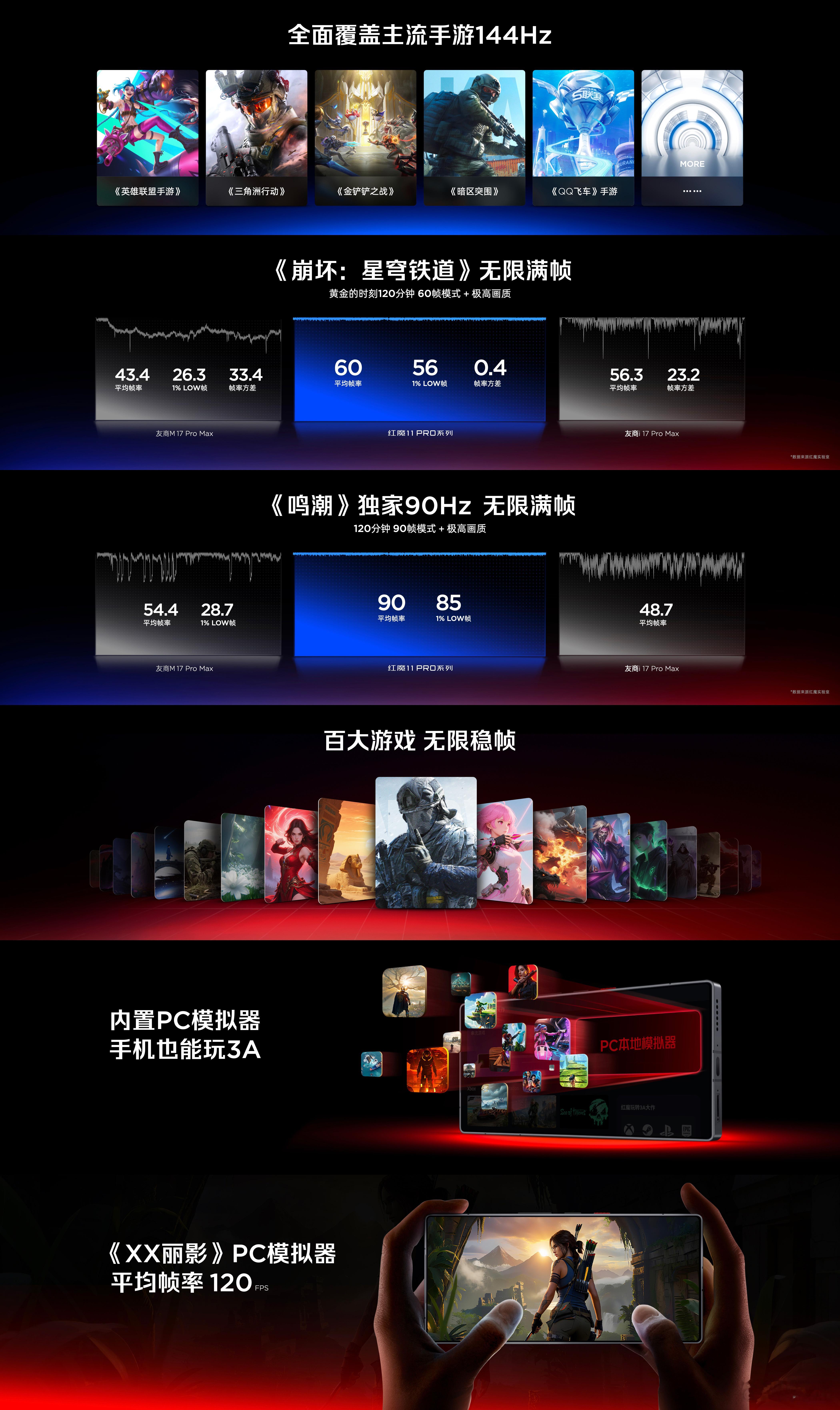 红魔11Pro水冷手机搭载第五代骁龙8至尊版+红芯R4,安兔兔跑分高达435.8万分,支持200多款游戏超分超帧并发,全面覆盖六大类主流手游144Hz,内置PC模拟器,手机也能玩3A。