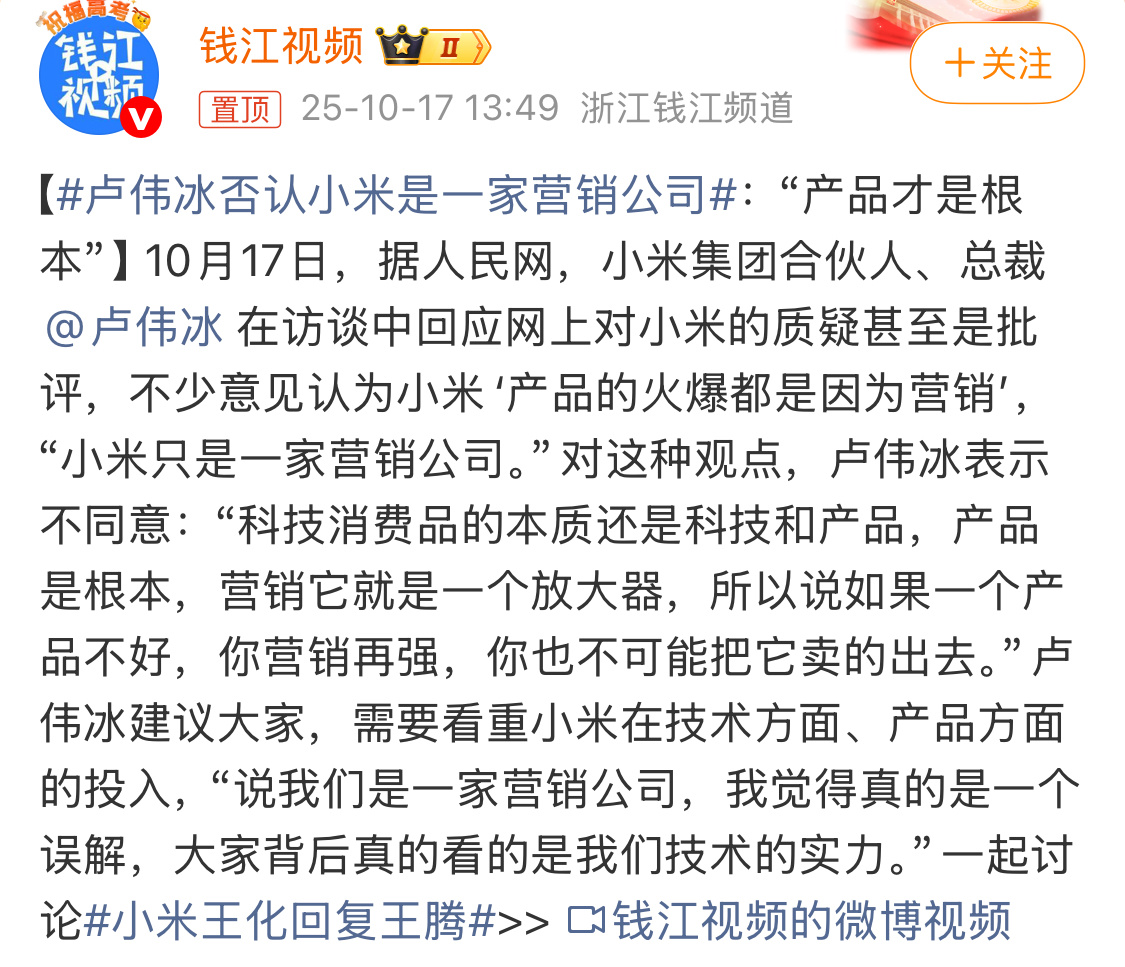 卢伟冰否认小米是一家营销公司营销为辅,产品才是根本。如果小米产品不够硬,营销再好