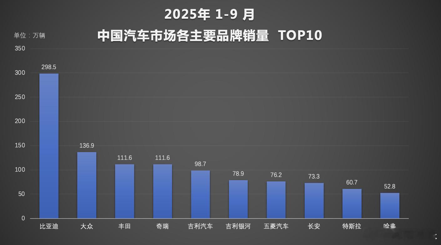 比亚迪在新能源汽车板块继续强势领跑,1–9月累计销量竟然高达326万辆,月度与前三季度累计销量均位居中国车企集团第一,并且已经完成全年460万辆目标的71%,照这个势头完成全年目标简直轻松拿捏。