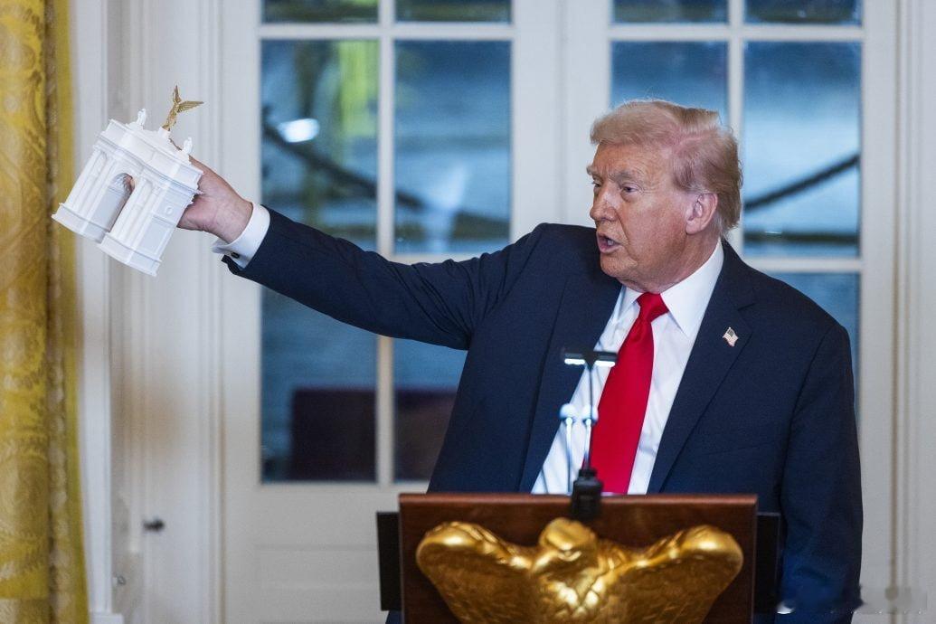 特朗普在白宫举办筹款晚宴,向众宾客展示拟在华盛顿修建的凯旋门。他说有三种尺寸,他