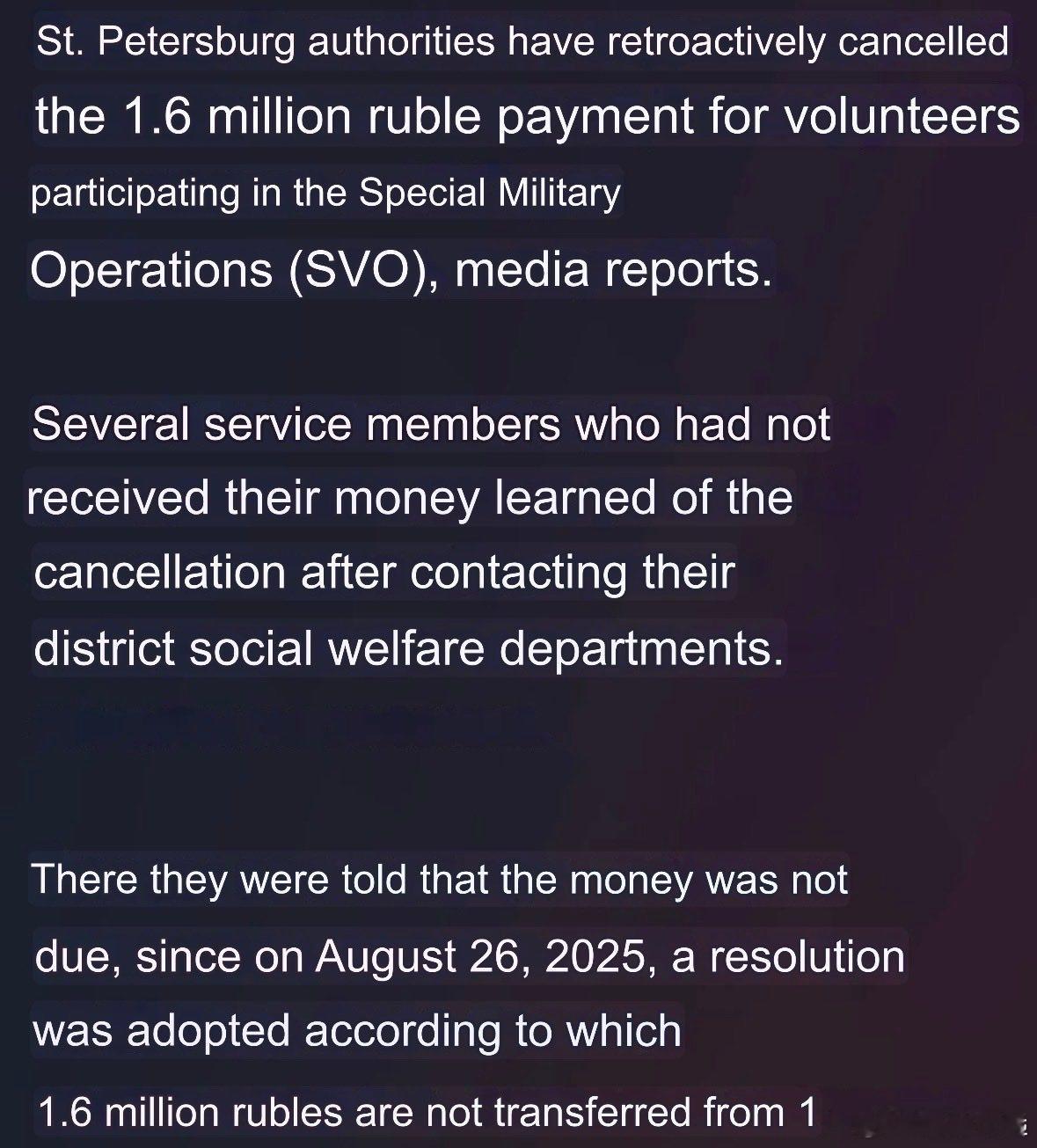 2、在圣彼得堡参军的前线俄罗斯士兵现在发现,当初说服他们参军的巨额款项并没有到账,而是被追溯取消了。 俄罗斯政府没钱了。