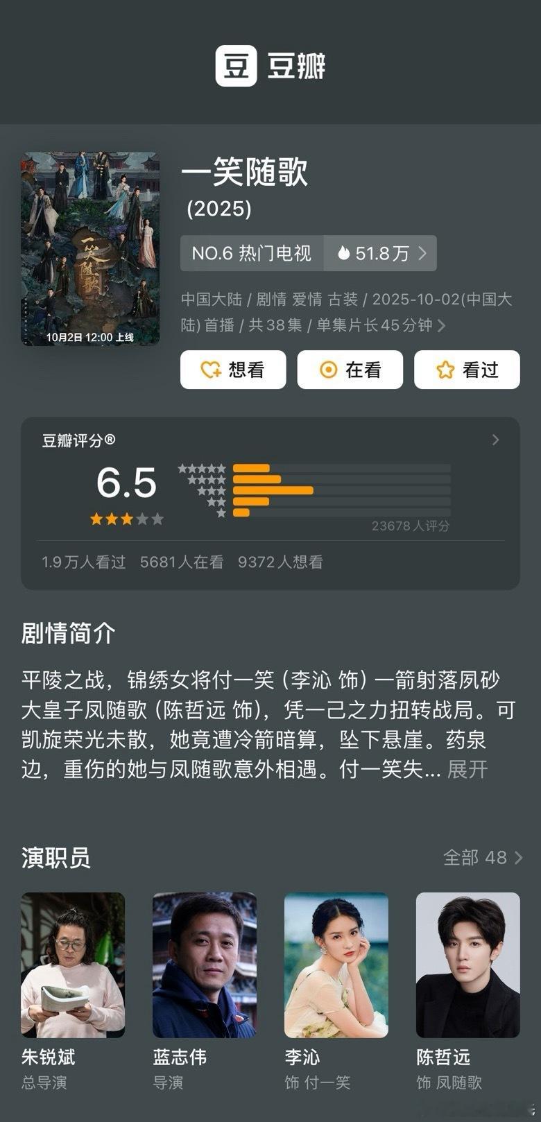 李沁、陈哲远一笑随歌豆瓣开分6.5