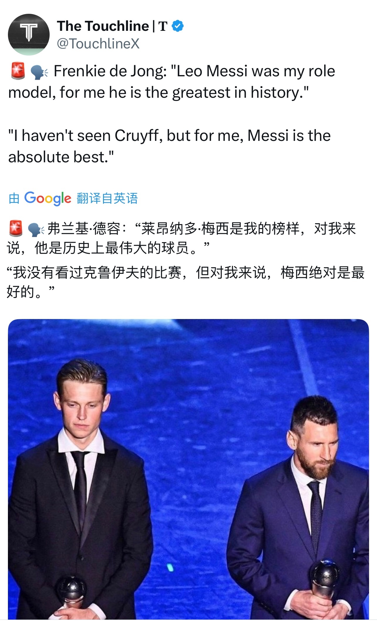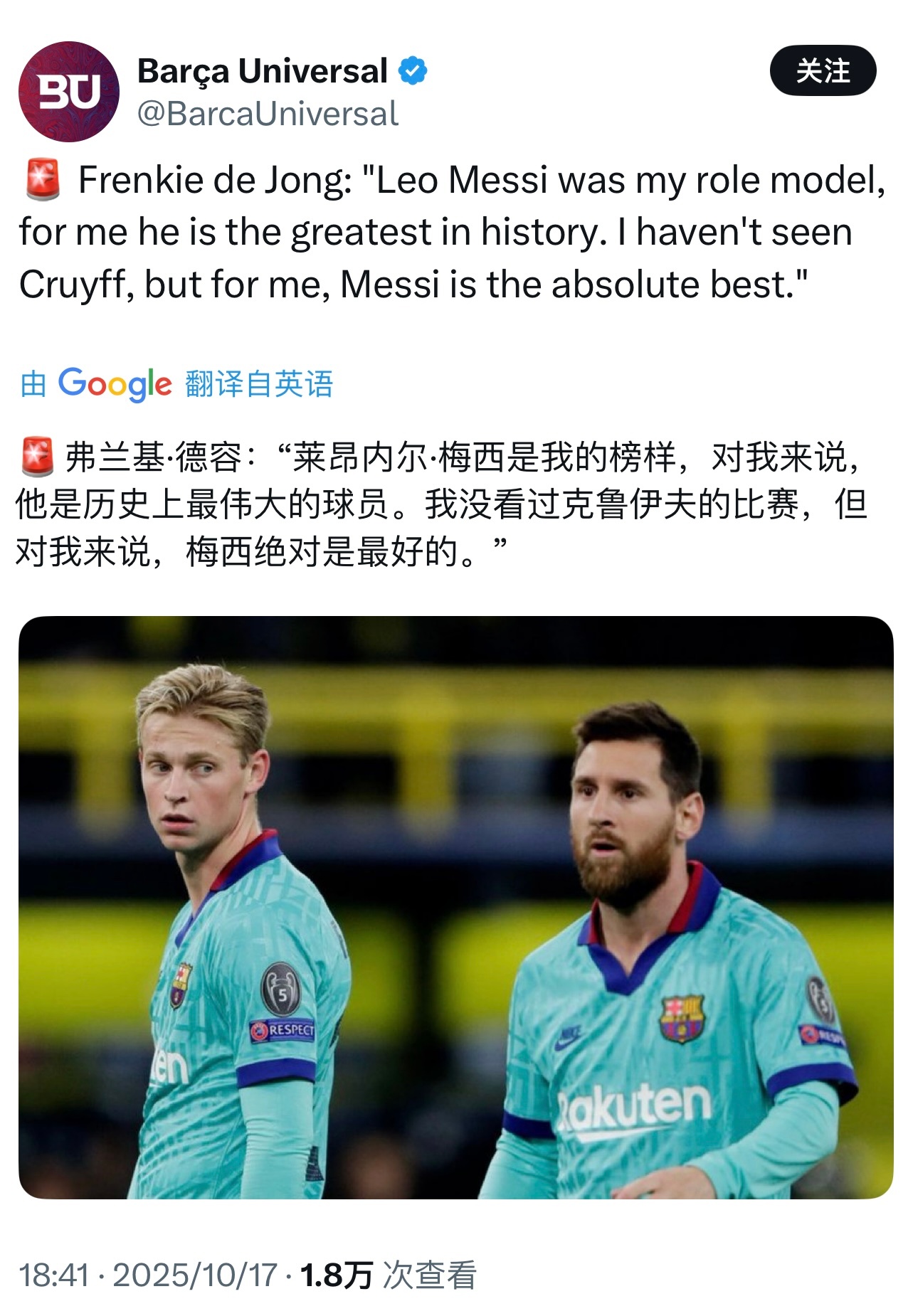 德容:“梅西是我的榜样,对我来说,他是历史上最伟大的球员。