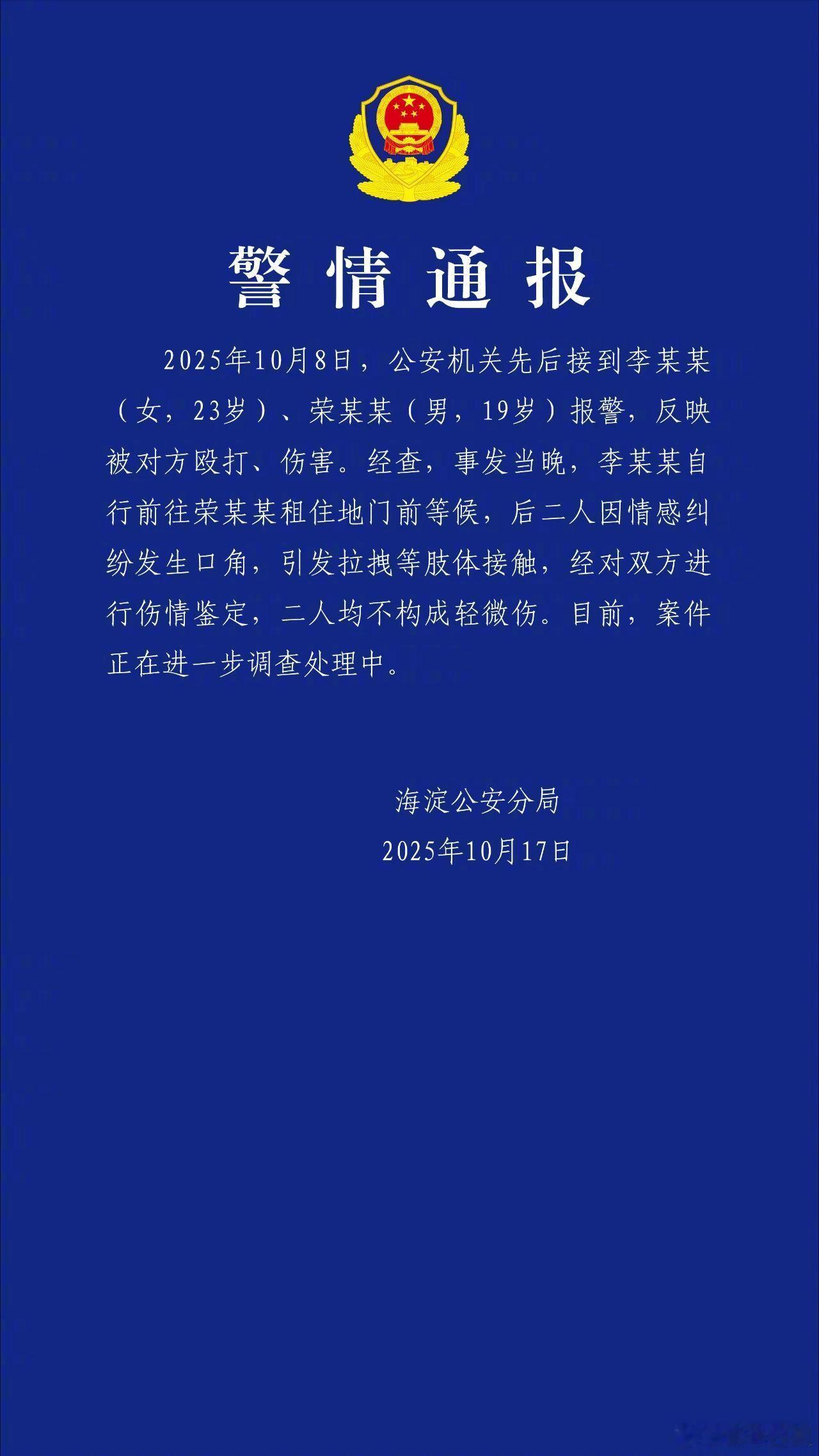 关于荣梓杉和李禹熹的通报来了警方通报荣梓杉李禹熹纠纷荣某某李某某因情感纠纷引发拉