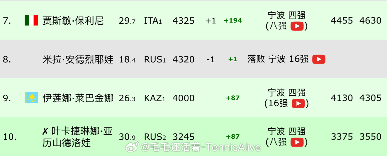 莱巴金娜晋级后,给自己的年终之旅留了一些机会。你们觉得她可以依靠宁波和东京的比赛压线晋级么?