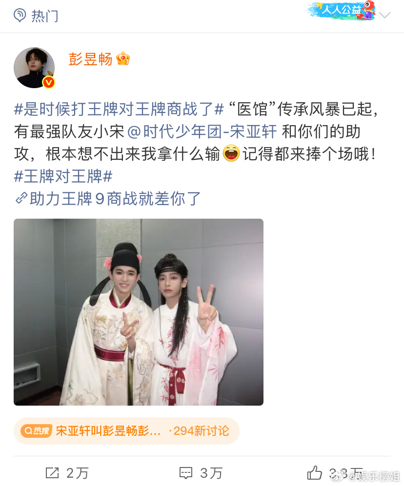 宋亚轩叫彭昱畅彭彭哥《王牌对王牌》宋亚轩彭昱畅搭档,小宋和彭哥哥这个双强组合颜值默契度满分,如果再加上大家的助力,那一定输不了[爱慕]王牌对王牌