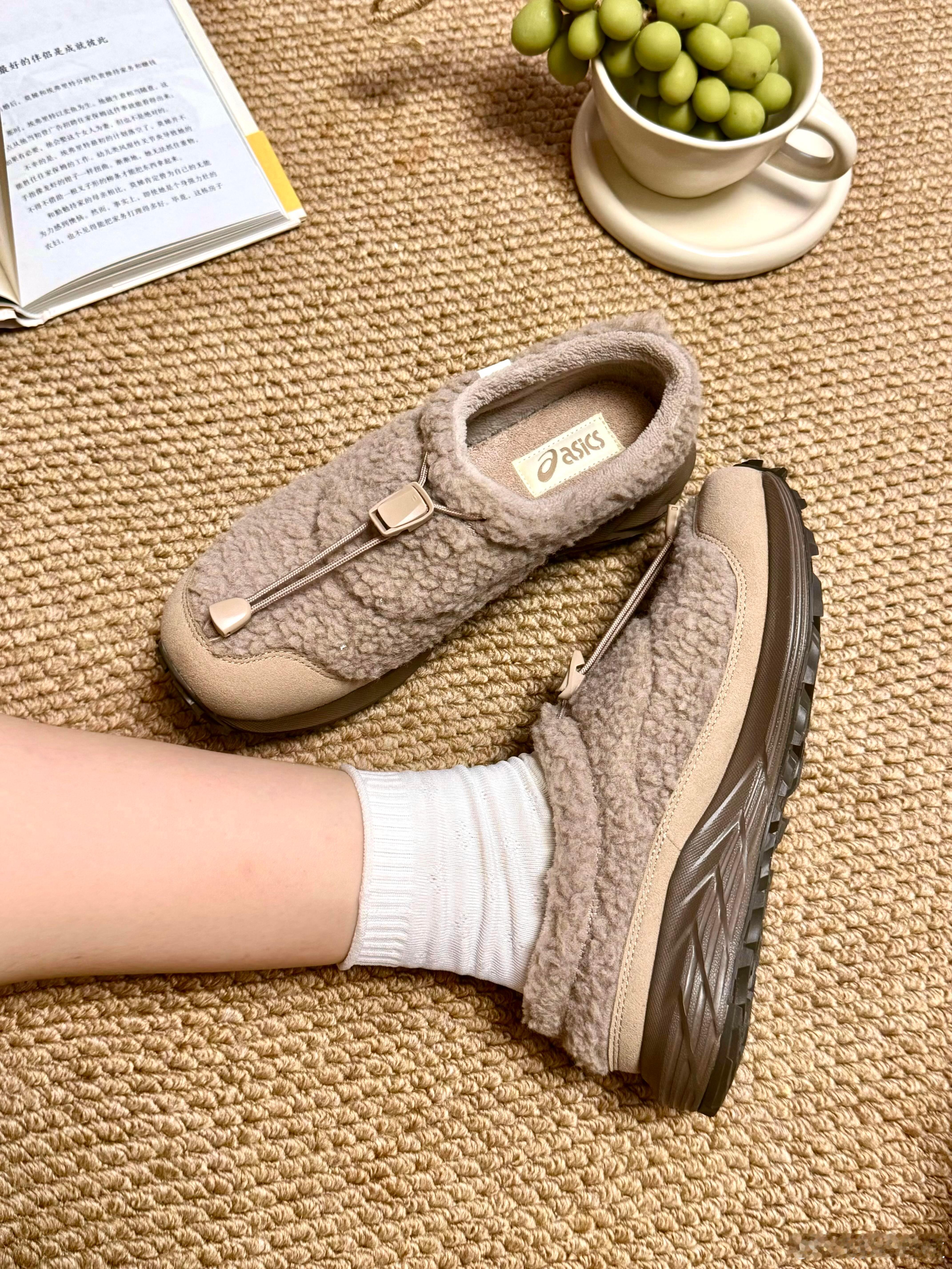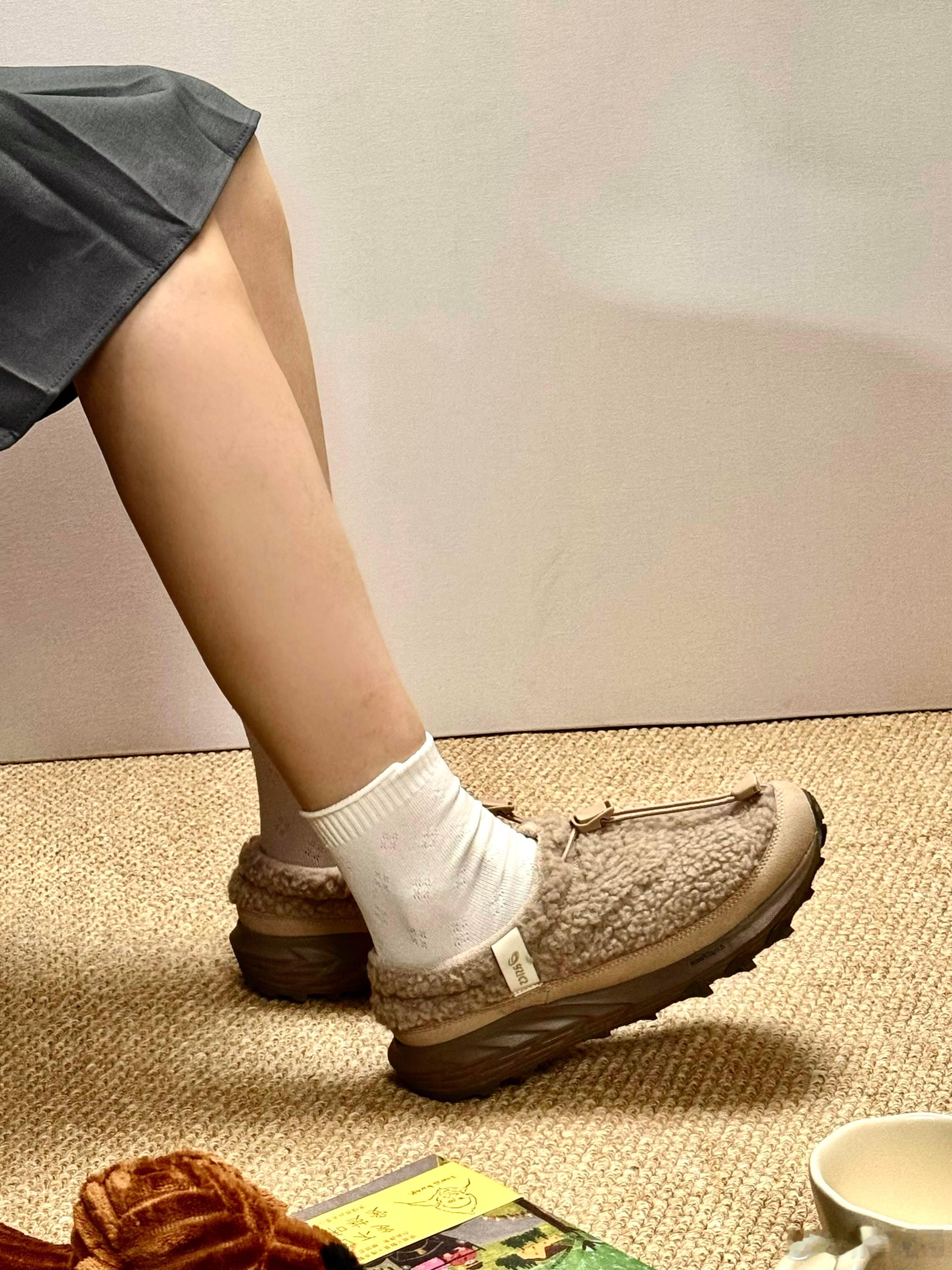 这双休闲鞋以简约温暖的设计诠释了日常舒适穿搭。浅棕色毛绒鞋面质感蓬松柔软,赋予双脚被包裹的温暖感,同时营造出慵懒松弛的视觉风格。深棕色厚底设计不仅增强了鞋型的立体感,也提升了穿着缓冲性与稳定性。鞋款轮廓圆润流畅,搭配白色短袜更凸显清新休闲气息,无论是搭配深色下装或日常裤装都能轻松融合。整体兼具居家般的惬意与出街的时尚感,是秋冬季节温暖又实穿的理想选择。时尚鞋履