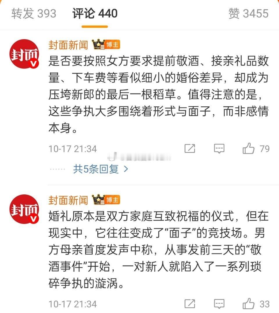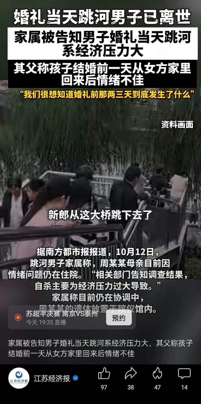 🔻开始说男子因婚礼琐事情绪失控,然后又说跟彩礼没关系,后面又说系经济压力大,现在变成:是否要按照女方要求提前敬酒、接亲礼品数量、下车费等婚俗。呵呵![摊手][摊手]
