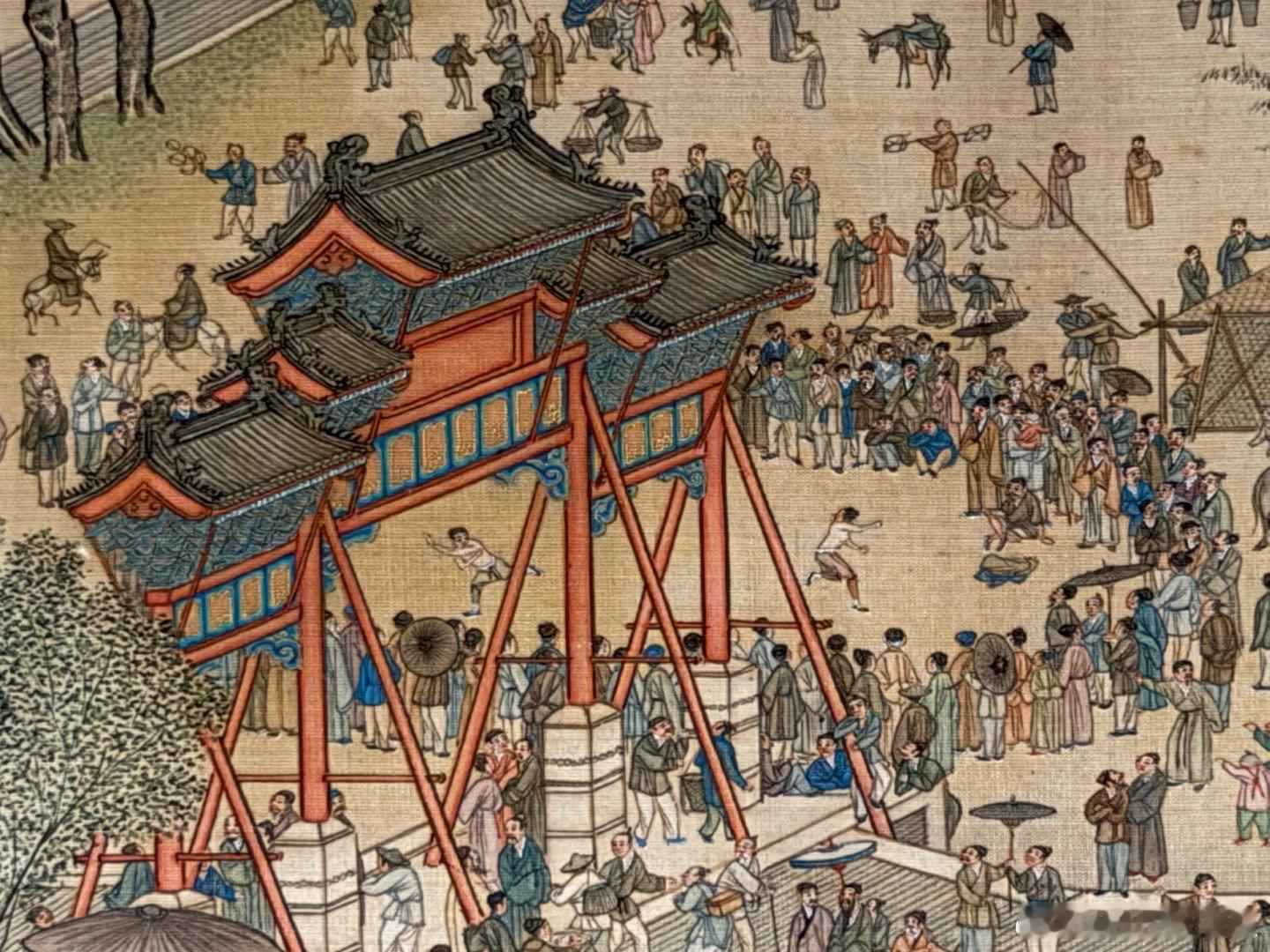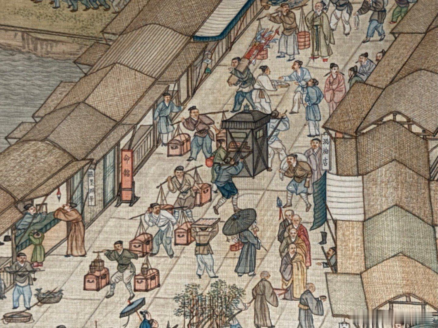 清乾隆元年(1736),清宫画院五位画家——陈枚、孙祜、金昆、戴洪、程志道,在乾隆皇帝的要求下合作完成了一版清明上河图。此画纵35.6厘米,横1152.8厘米,比张择端的清明上河图(纵24.8厘米,横528厘米)要大的多。画面上人物也更多,宋版的有五百多人,这版大约九百人,画风极为细致,代表了清代中期人物界画的巅峰水平,令人叹为观止。