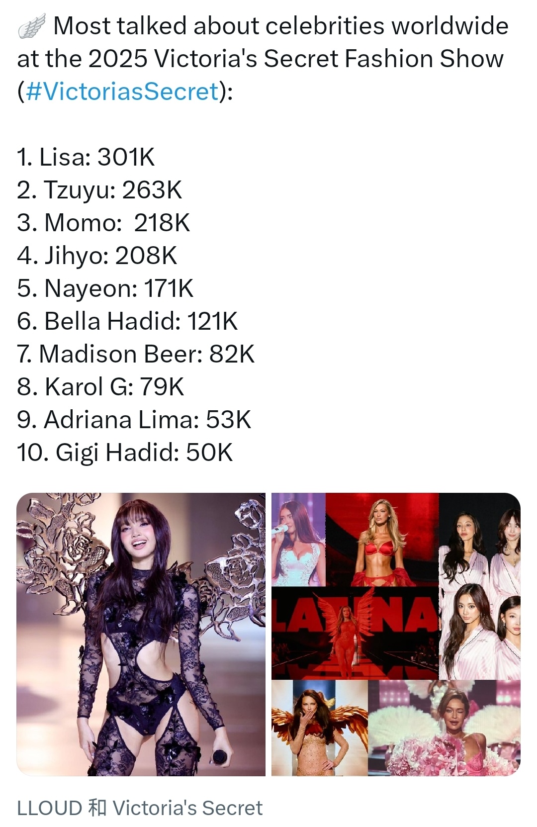 2025“维多利亚的秘密”时装秀全球热议名人⬇️Lisa人未到但热度第一!!!女
