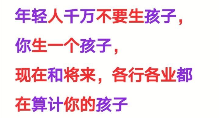年轻人,为什么不生孩子? 前几天,未婚女说,宁愿生私生子,我不和穷男人结婚,要生孩子,除非孩子不被人算计。 你怎么看? 提升出生率,建议体制内的每对夫妻生它三个五个八个的,最好生一窝,生个足球队,他们有钱有闲,将来他们的孩子长大了,一部分继续进入体制内,继续生三五个八个,不就得了,无穷尽也,加油,看好他们!!! 我看过最多的一种说法是现在生小孩的成本太高了。 但是,其实抛开生小孩这种问题来看,我感觉现在很多年轻人也会有一些人感觉“恐婚”。