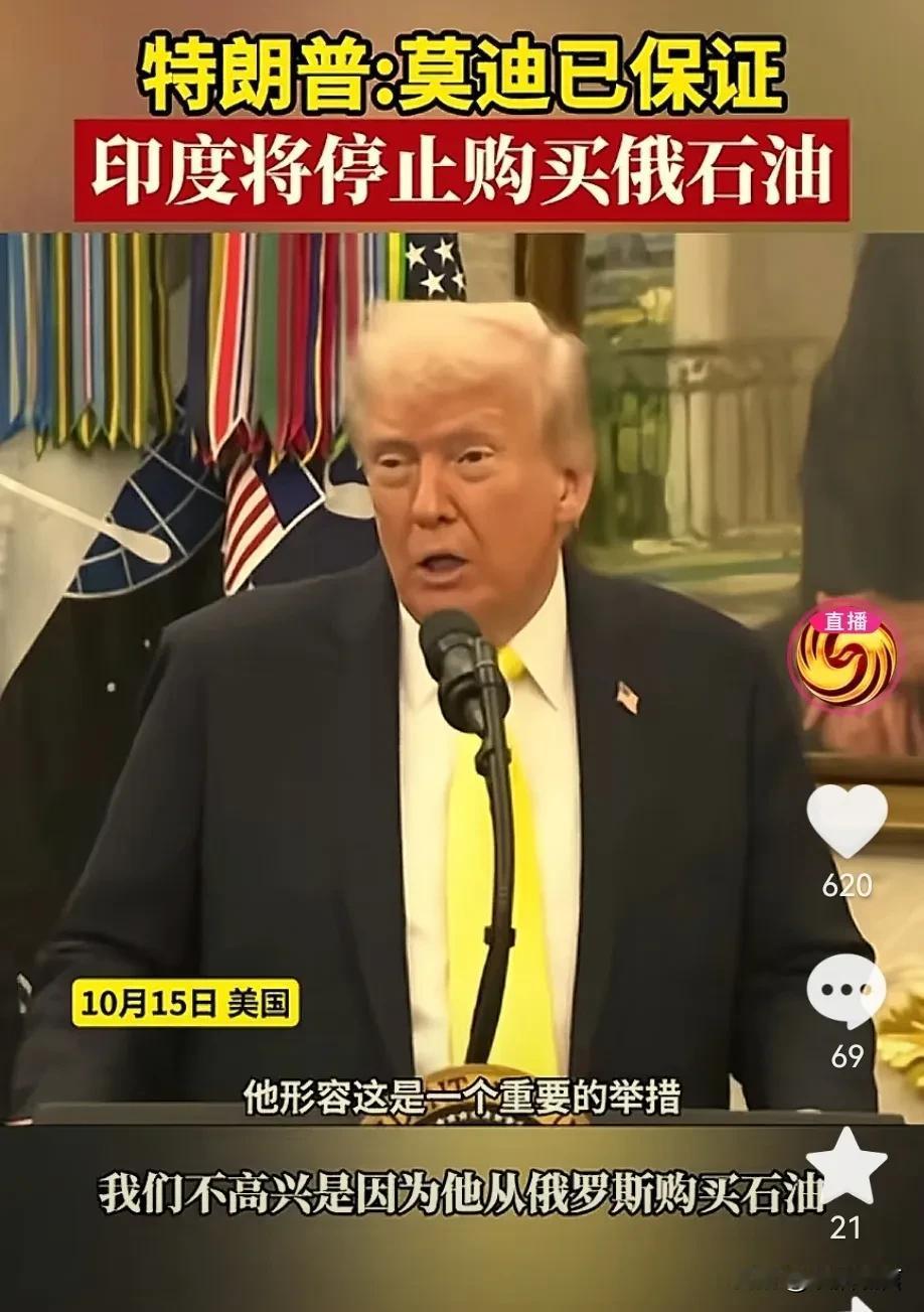 印度又被特朗普“挟持了”,印度还是向美国低头了,普京如何应对? 在特朗普的关税战以及其他领域的威胁和恐吓下,印度最终还是低头了,印度已向美国保证不再购买俄罗斯石油,特朗普给印度高度赞赏! 对于印度来说,目前是向美国做了保证,但是对于印度这样的国家 ,这种保证基本上没有什么作用。 印度一直是一个东摇西摆的国家,与特朗普差不多,为了利益根本不在乎自己的信誉和承诺。 印度这样做也是为了缓解与美国关系,印度一直是一个投机倒把的国家,而且俄罗斯的石油让他们赚的盆满钵满,怎么可能放弃嘛大家认为是不是?