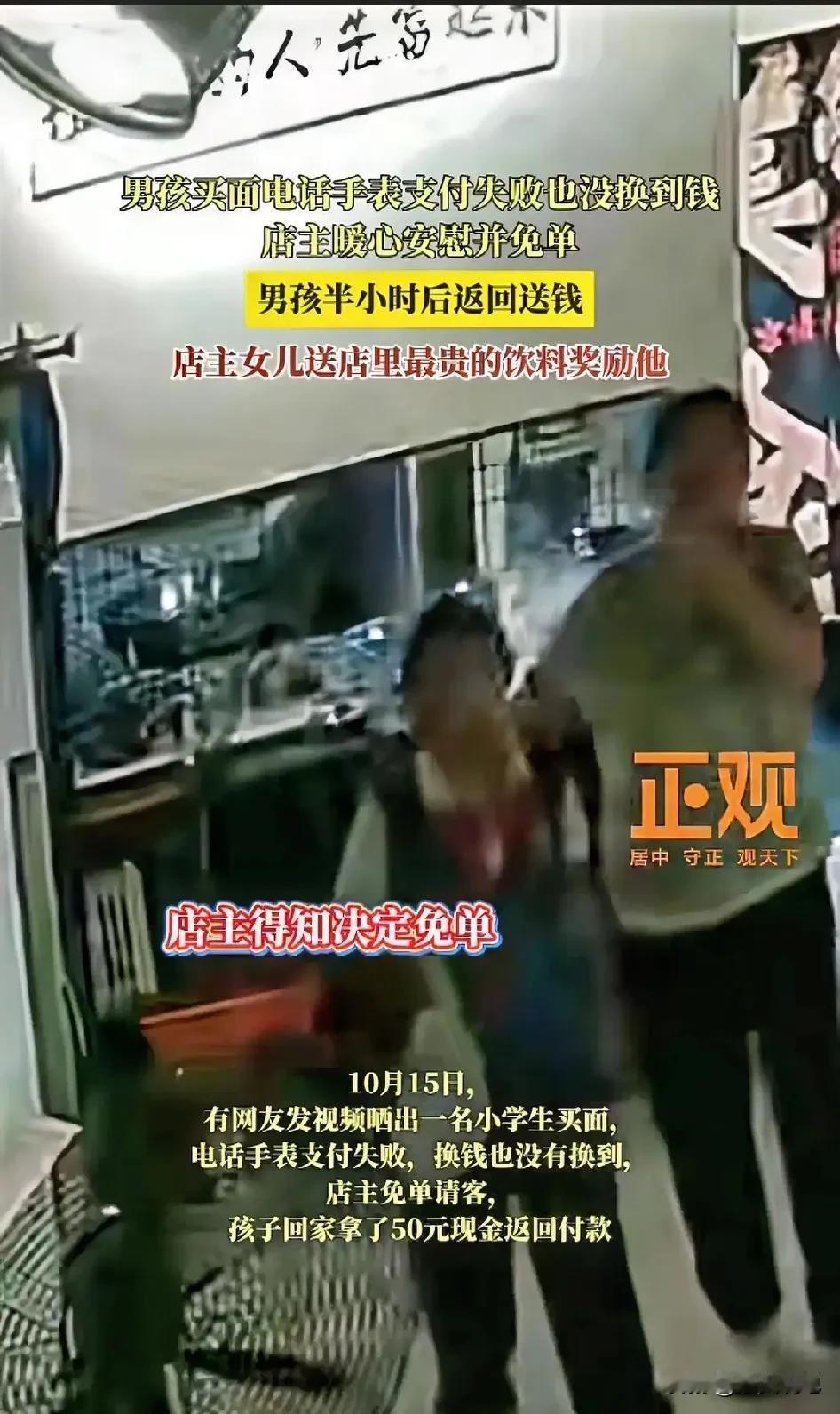 “必须点赞!”近日,一男孩去买面条,结果电话手表扫码失败又没换到现金,不料,店主的一个善意举动温暖了所有人。更让人没想到的是,男孩半小时后的返回,让这个温暖故事有了更完美的结局! 而老板也说,当时男孩用电话手表支付面条钱没成功,身上也没带现金,看着挺着急的,就安慰他说没关系,先让他把面拿走了。 没想到,半小时后,孩子特意跑回来送钱,坚持要把账结清。 男孩的诚信让店主一家非常感动。店主的女儿特地拿店里最贵的一瓶饮料奖励他,说这样的好品德太难得了。 这段暖心视频被传到网上后,引发网友热议。有网友说:“都是善良的人!老板善良,孩子诚信,这样的双向奔赴太温暖了!” 也有网友说:“孩子冒着雨跑回来送钱,这份诚实担当的品质真是难得,家长教育得真好!” 还有网友说:“为老板的善心和格局点赞!不仅免单还送饮料,用行动告诉孩子:好品德永远会被珍惜和奖励!” 必须点赞!老板的格局和孩子的品德,都是教科书级别的 冒着大雨折返送钱的模样,简直不要太帅气!这份刻在骨子里的诚信,背后一定是父母日积月累的言传身教。 而老板用一碗面、一瓶饮料,守护了孩子最珍贵的赤诚,也告诉我们:善良遇见诚信,便是这世上最暖的双向奔赴。 愿这样的美好,能被更多人传承和奖励! 来源:正观新闻