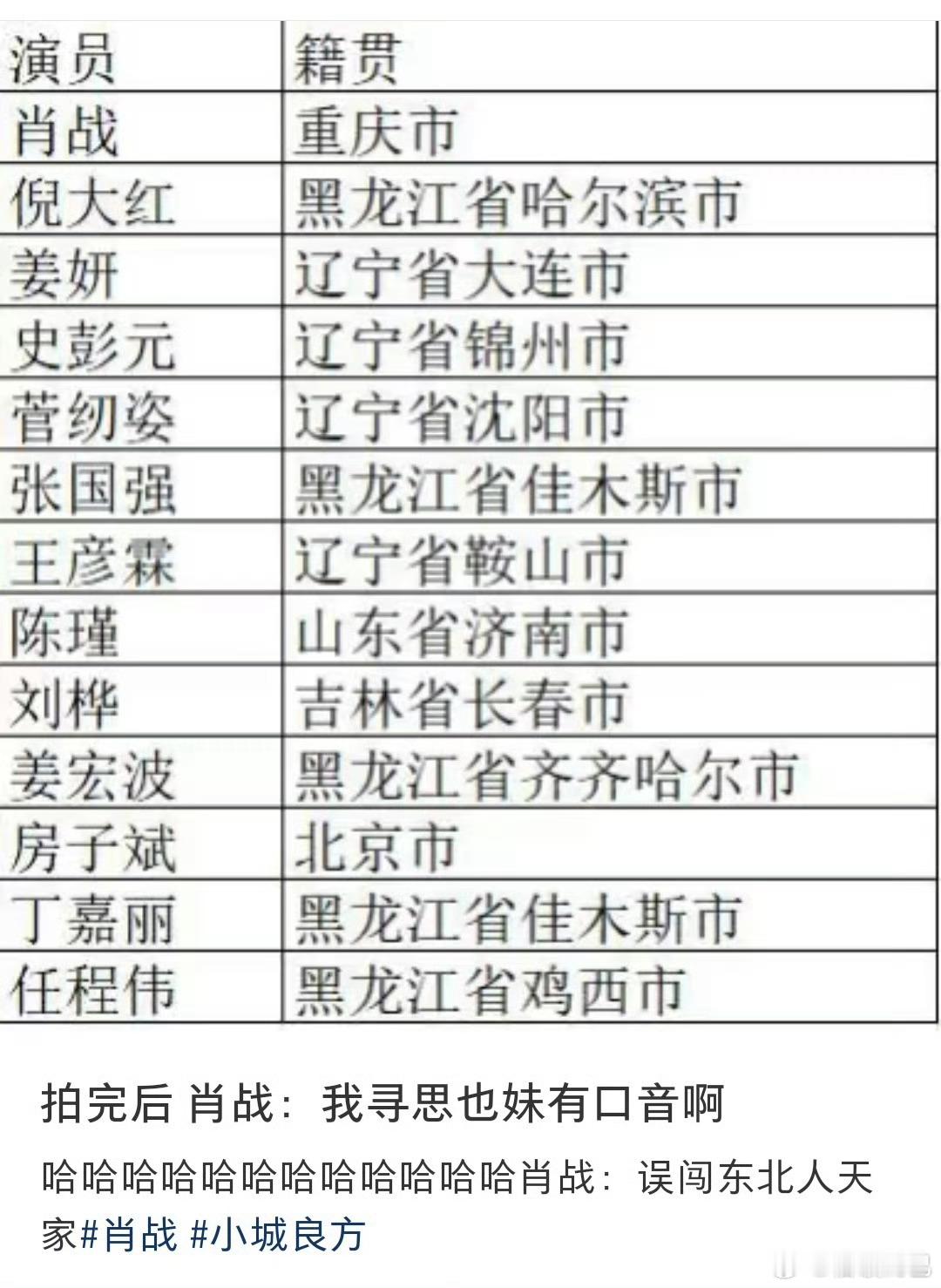 重庆人肖战勇闯东北小城良方演员籍贯主演阵容很强了,都是演了很多年戏的老演员。而且剧组就真的找了10个籍贯东北的主演 ,一个南方人被东北人包围了,啊啊啊啊好想听讲东北话的小赞赞台词🥹小城烟火里,升腾起各自的人生良方。感觉这句话就很治愈 ,配上一座小城 那种氛围感😭小城良方