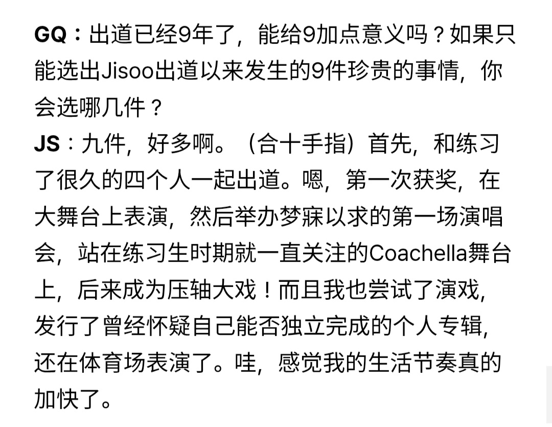 GQ:出道已经9年了,能给9加点意义吗?如果只能选出Jisoo出道以来发生的9件珍贵的事情,你会选哪几件?