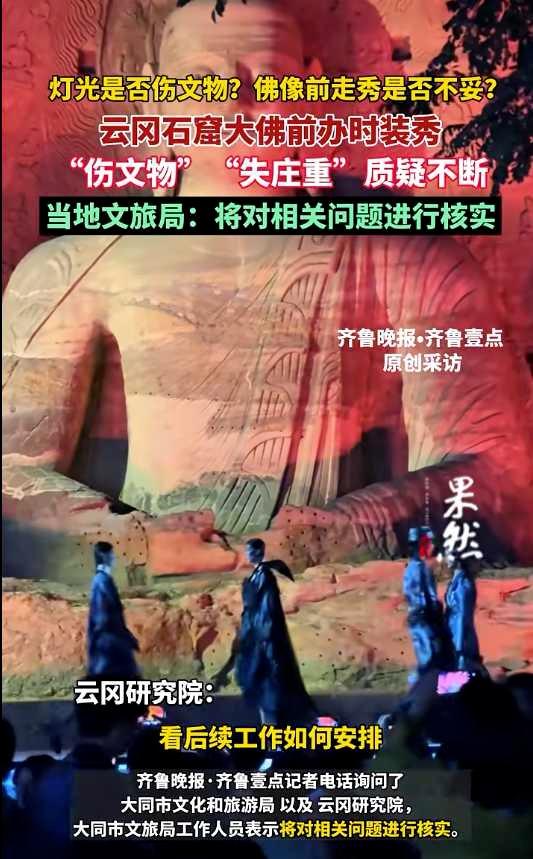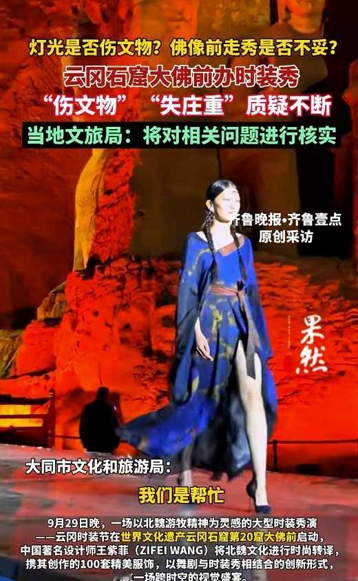 云冈石窟大佛前办时装秀引争议,这背后的问题值得我们深思。 你能想象吗?聚光灯下,模特身着现代时装,行走于历经1500年风雨的佛像脚下。9月29日晚的这场云冈时装节,将现代设计与古老遗迹放在了一起,形成了强烈的视觉对比。然而,赞誉与批评声浪也同时爆发。有人认为,这是将文化符号进行创造性转化的实践,能让传统文化走进现代生活。可反对者却觉得,商业活动不应侵扰佛门清静与文化尊严。 从现实角度看,文物保护专家指出,在文物保护单位保护范围和建设控制地带内进行影视拍摄或大型活动,必须经过严格的审批程序。而这场时装秀的核心争议点,正在于是否履行了完备的报批手续,以及现场执行是否完全符合文物保护的要求。历史学者也表示,云冈石窟首先是历史遗迹和宗教场所,过度商业化开发,会消解其深厚的历史文化底蕴。此前就有类似活动造成了文物损伤,比如去年11月云冈石窟第20窟的一场秀,事后石窟表面出现了光化学损伤。 文化的传承与创新,本是好事,但必须有边界。就像北京大学研究文化遗产管理的教授说的:“‘活化利用’与‘保护优先’从来不是一道非黑即白的选择题,而是一道需要极高智慧的平衡题。”我们不能让文化的“活化”以“破坏”为代价。希望相关部门能妥善处理此事,给公众一个满意的答复,也为文化传承与创新找到一个合适的平衡点。让我们既能欣赏到现代与传统结合的魅力,又能确保古老的文化遗产得以完好传承。